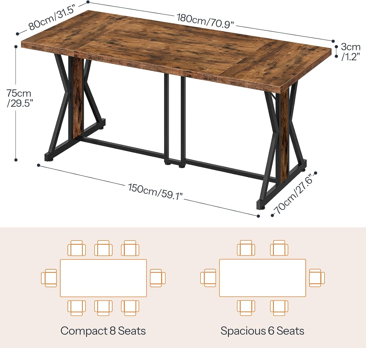 Spacious Design: This 70.9 inch dining table comfortably seats 6-8 people, perfect for family gatherings or entertaining guests. With its large size of 70.9”L x 31.5”W x 29.5”H, there is ample space for everyone to gather and enjoy a meal together. The dining room table’s height ensures comfortable seating and dining, creating the comfortable setting for extended dinners or engaging discussions
