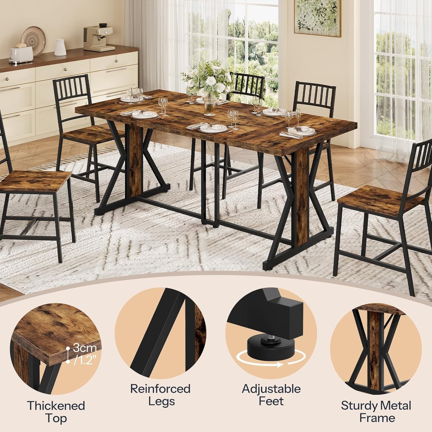 Sturdy Construction, High Weight Capacity: The wooden kitchen table boasts a thick tabletop, reinforced legs, a stable support frame with X-crosses and 6 adjustable feet, providing strong support for daily use and ensuring stability and durability