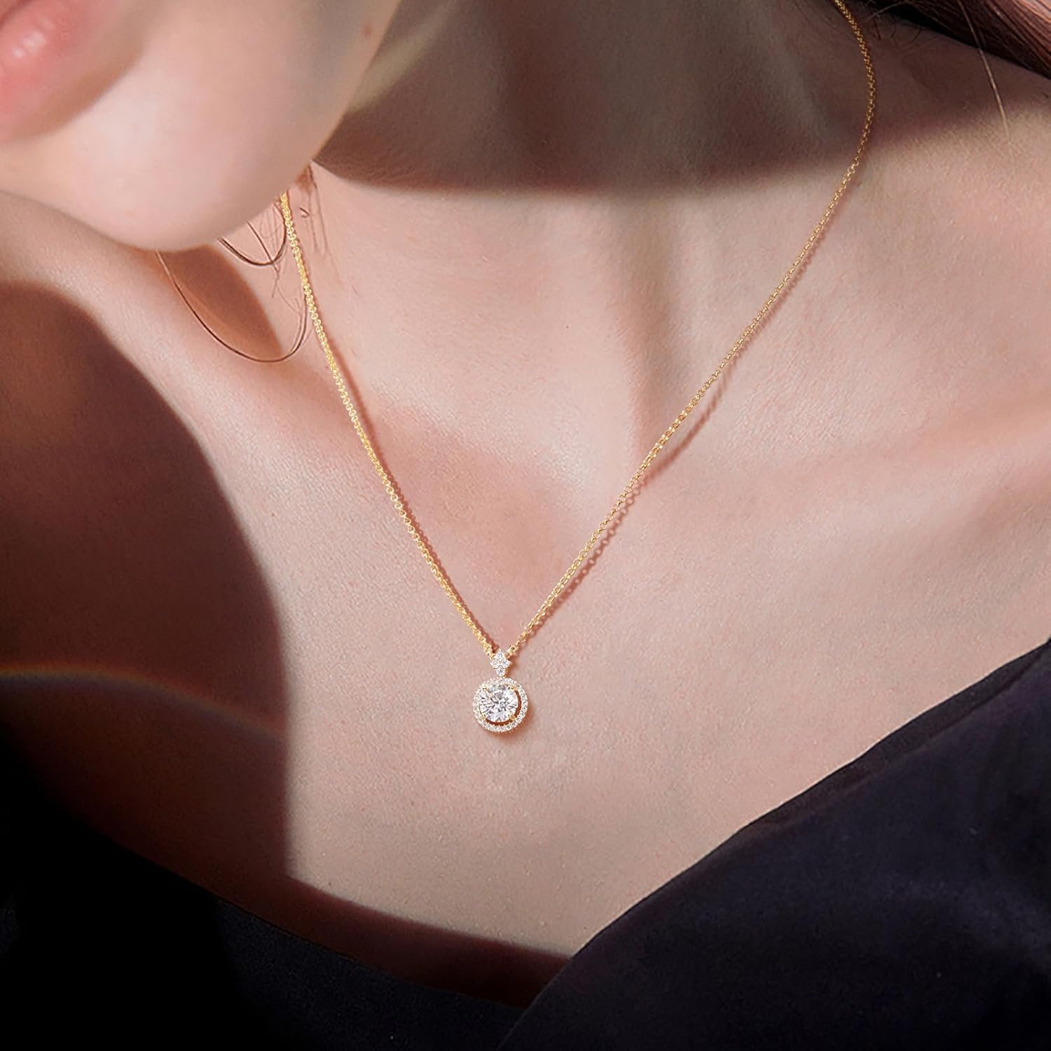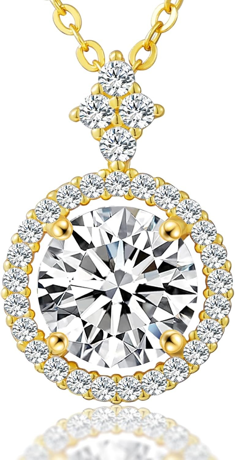 Imitation Diamond Necklace for Women 1ct/1.2ct/2ct, 18K Gold Vermeil Moissanite Halo Pendant Necklace, Skin-friendly .925 Sterling Silver 18″ Chain + 2″ Extender, D Color VVS1 Lab-created Diamond Jewelry Gift for Women
