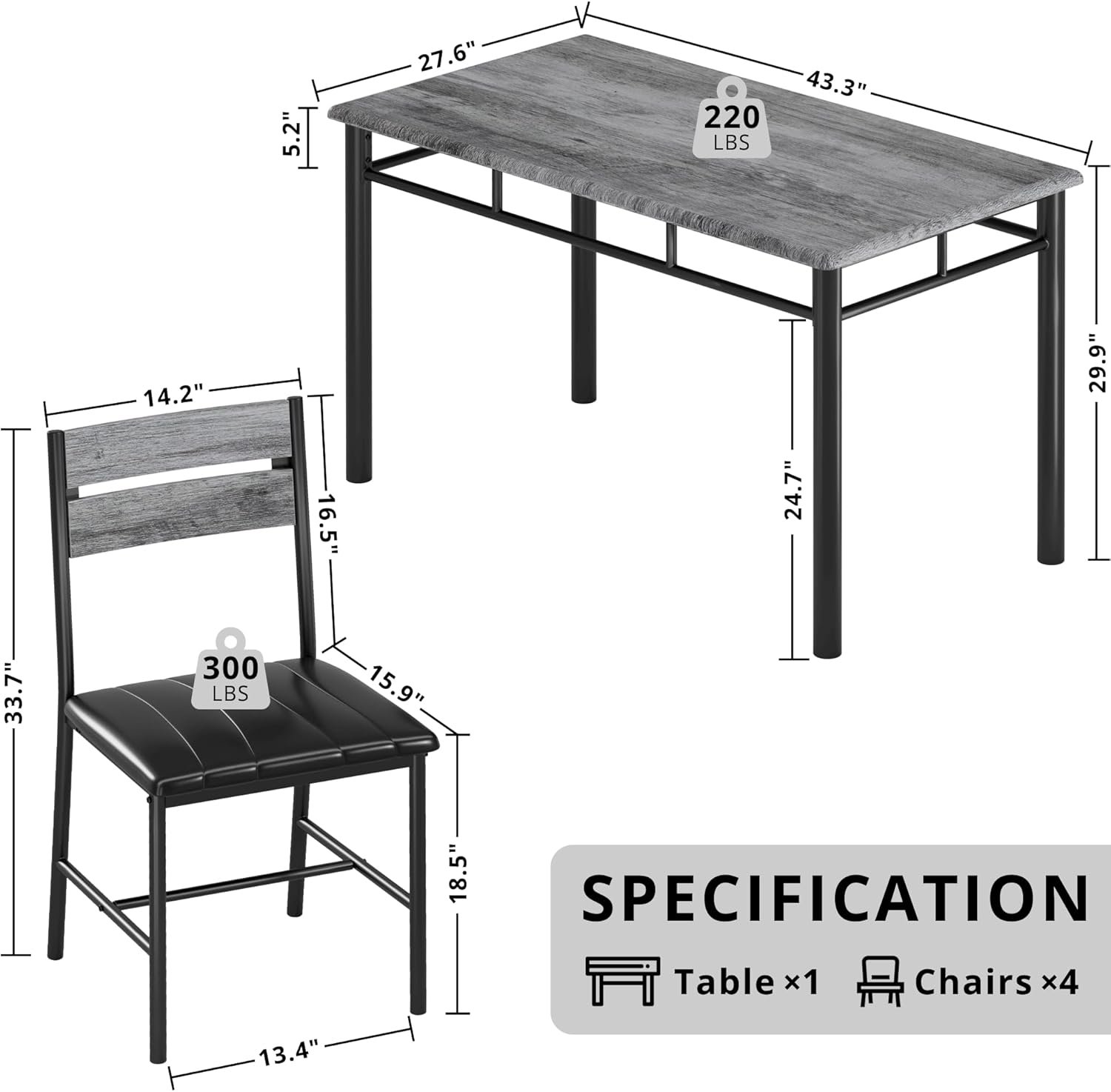 Color Gray Material MDF Wood, Metal Item Weight 70 Pounds Style Modern Feature 5-Piece Dining Set Item Dimensions 43.3″(L) x 27.6″(W) x 29.9″(H)