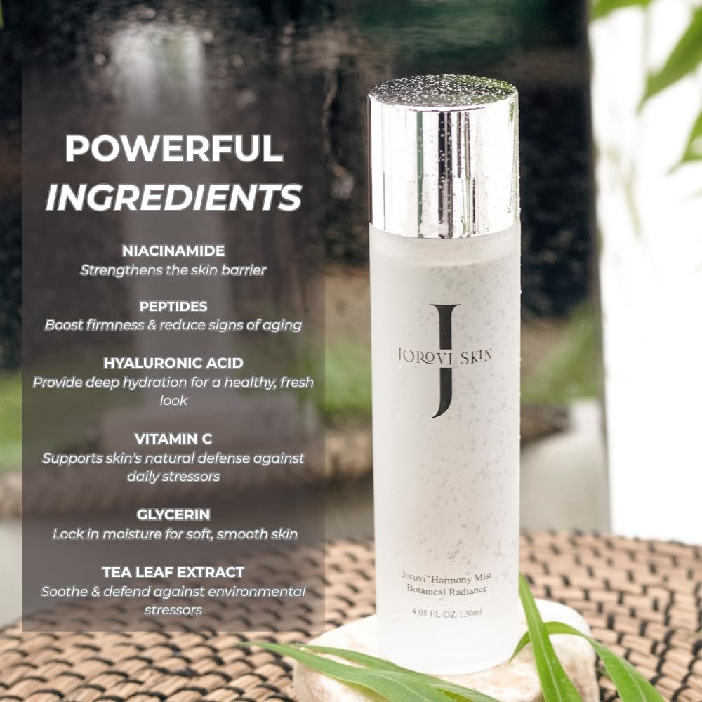 Face Toner – Harmony Mist Botanical Radiance: Formulated with Niacinamide and Vitamin C, this facial toner boosts radiance, tightens pores, and deeply hydrates. It smooths skin texture and shields against environmental stress for a refreshed, healthy glow