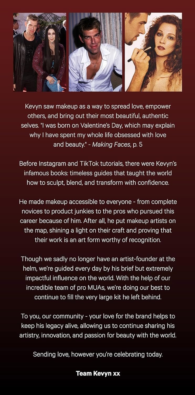 KEVYN AUCOIN BEAUTY was founded in 2001 by one of the most iconic and influential makeup artists of all time, Kevyn Aucoin. To understand the root of the heritage beauty brand today, you must first start by understanding who Kevyn Aucoin was and why his legacy left a longstanding impact on the beauty world that continues to this day.In the words of Kevyn Aucoin himself, “First of all, let me say that I believe there are no rules when it comes to makeup. In a world of constant change…I feel the goal should be to expand our definition of what we consider ‘acceptable, normal and beautiful.’ The future will belong to those with open minds and open hearts, who can appreciate beauty in all its forms.” – Kevyn AucoinKevyn Aucoin Beauty is a brand that encompasses approachability, artistry, empowerment and celebrates originality. It’s unapologetic, brave and rather quite fearless. Kevyn himself believed that every woman is beautiful within, and makeup was simply his tool for helping her discover that beauty. He was a man and an artist decades ahead of his time, which has paved the way for innovative, award-winning products, high-performance formulas and textures. His luxurious textures and expansive shade ranges have had a global, broad appeal for over 20 years, when most brands had a limited shade range. He was a true industry pioneer who championed inclusivity, originality, empowerment and education, which you will see carried over today in the brand pillars. Whether you’re a makeup newbie or a pro makeup artist, and regardless of what age, or race you are, there is something for everyone with the brand’s approachable artistry positioning rooted deep in inclusivity.
