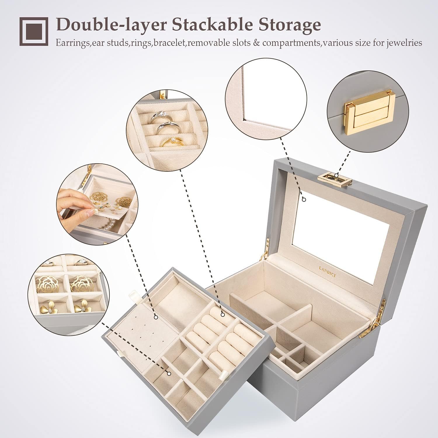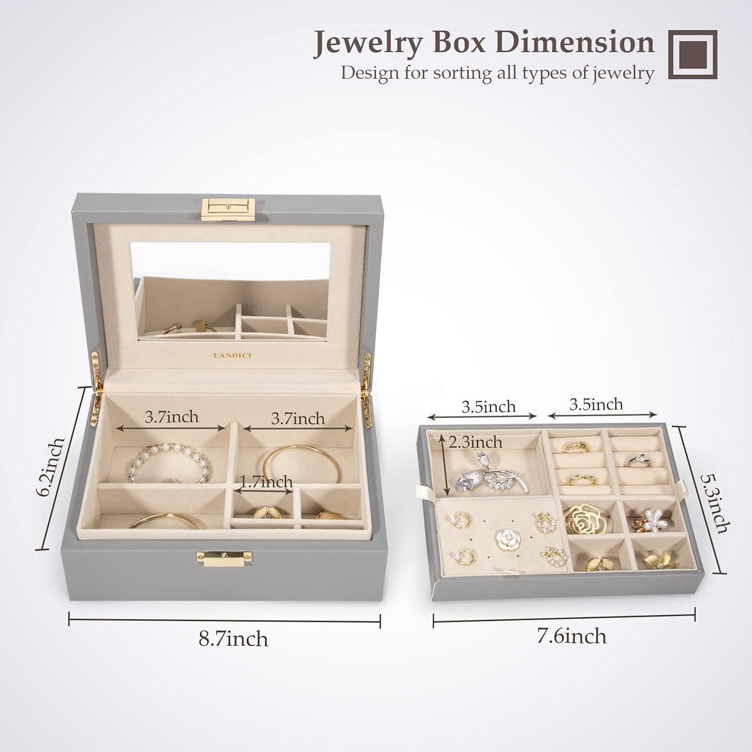 LANDICI Jewelry Organizer Box for Women Teen Girls,Large Jewelry Storage Case with Mirror,2 Layer Removable Stackable Tray,Leather Jewellery Display Holder for Ring Necklace Earring Bracelets,Grey
