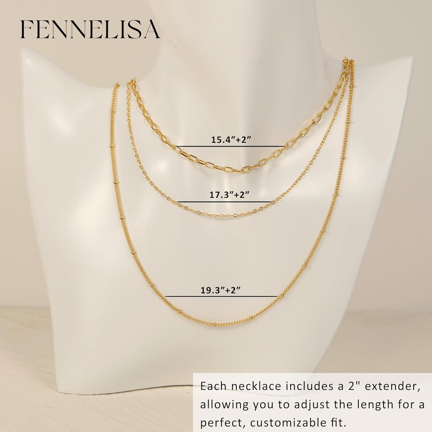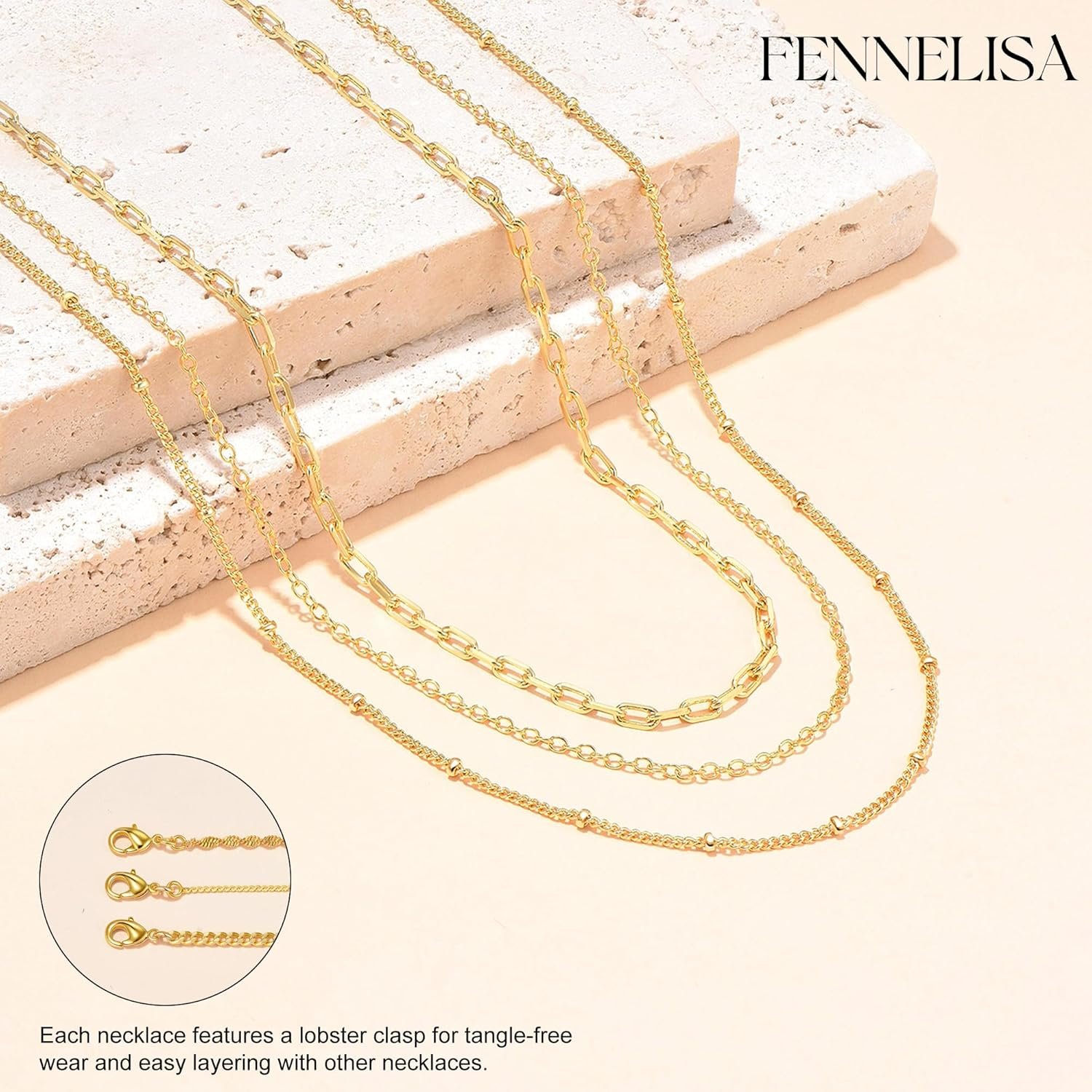 Each gold necklace features an adjustable lobster clasp, wear alone for a simple style.