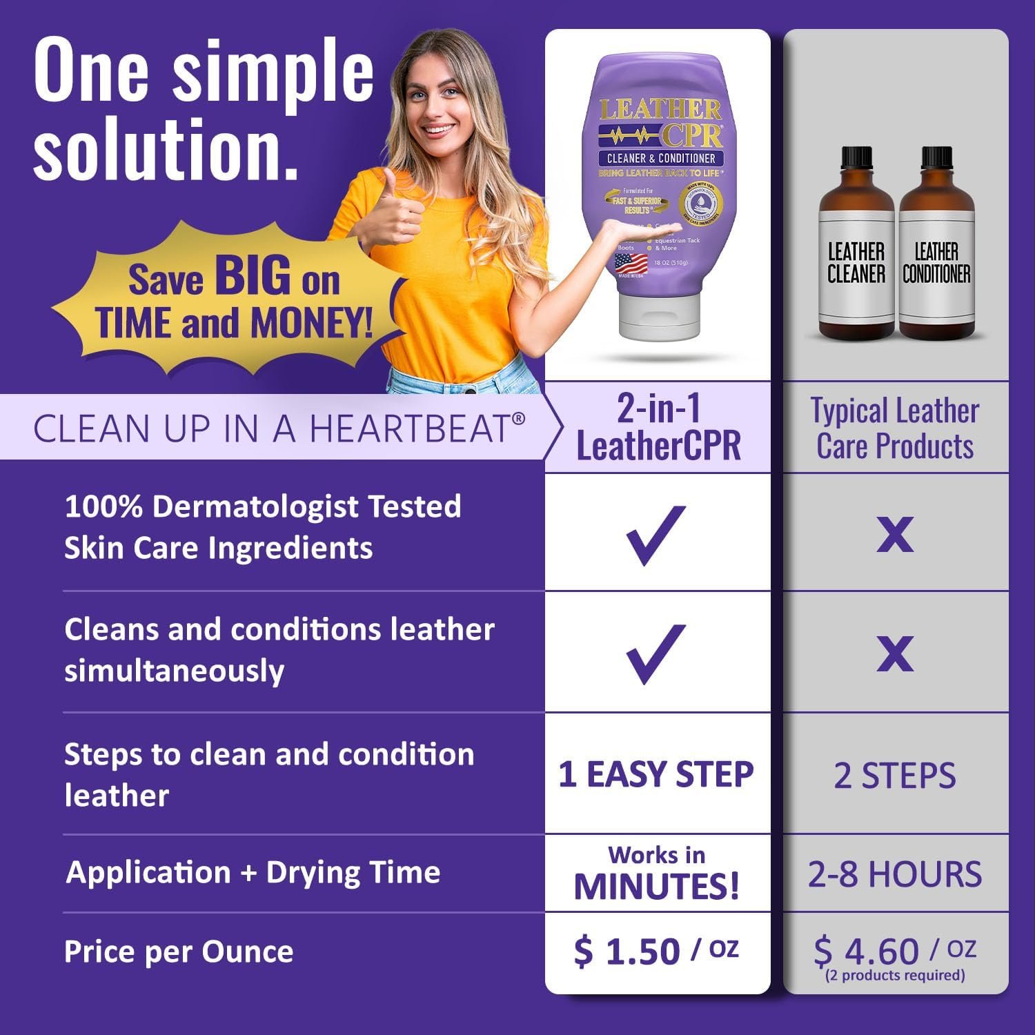 PREMIUM LEATHER CARE SOLUTION: Leather CPR leather cleaner and conditioner is ideal for maintaining leather’s texture and appearance, from leather couches and furniture to purses and shoes. Whether you need a leather couch cleaner and conditioner, a leather conditioner for purses, or leather cleaner for couches, our product delivers long-lasting results.