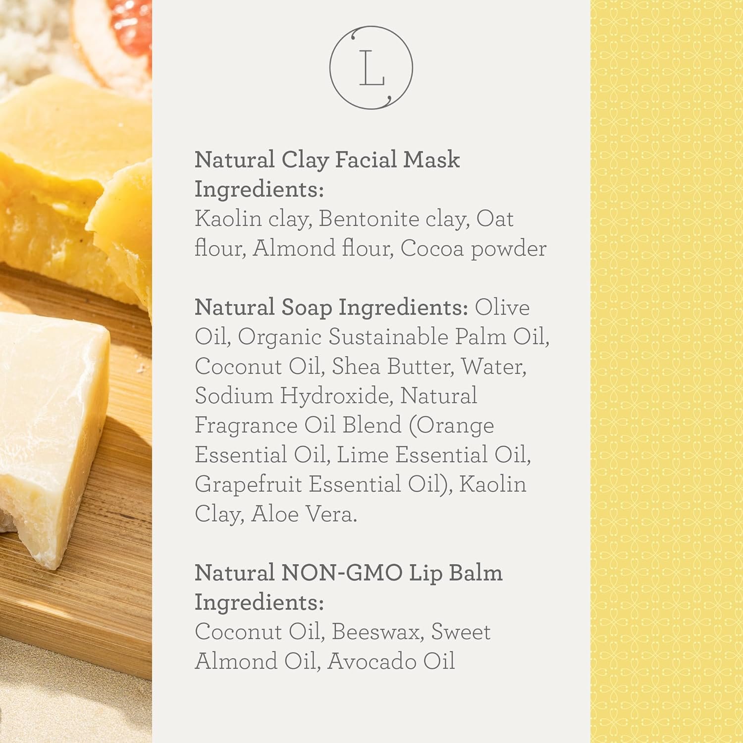 COMPLETE SPA DAY KIT FOR WOMEN: Relax and unwind with this gift box for women – our citrus bath set includes a citrus natural soap bar, a cotton eye mask, a clay facial mask, a large shower steamer, unscented lip balm, and a soap saver.
