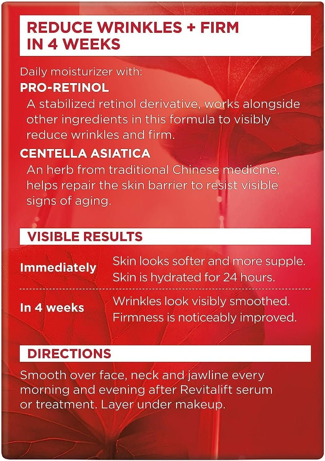 This unique daily moisturizer delivers anti-wrinkle and firming action, created specially to care for your face and neck. Experience advanced action against the signs of aging wth smoother, firmer skin in just 4 weeks. RevitaLift Anti-Wrinkle + Firming Face & Neck Contour Cream (with Pro-Retinol A and Stimuplex) increases cell turnover, reduces wrinkles, firms skin, and provides 24 hour moisturization.