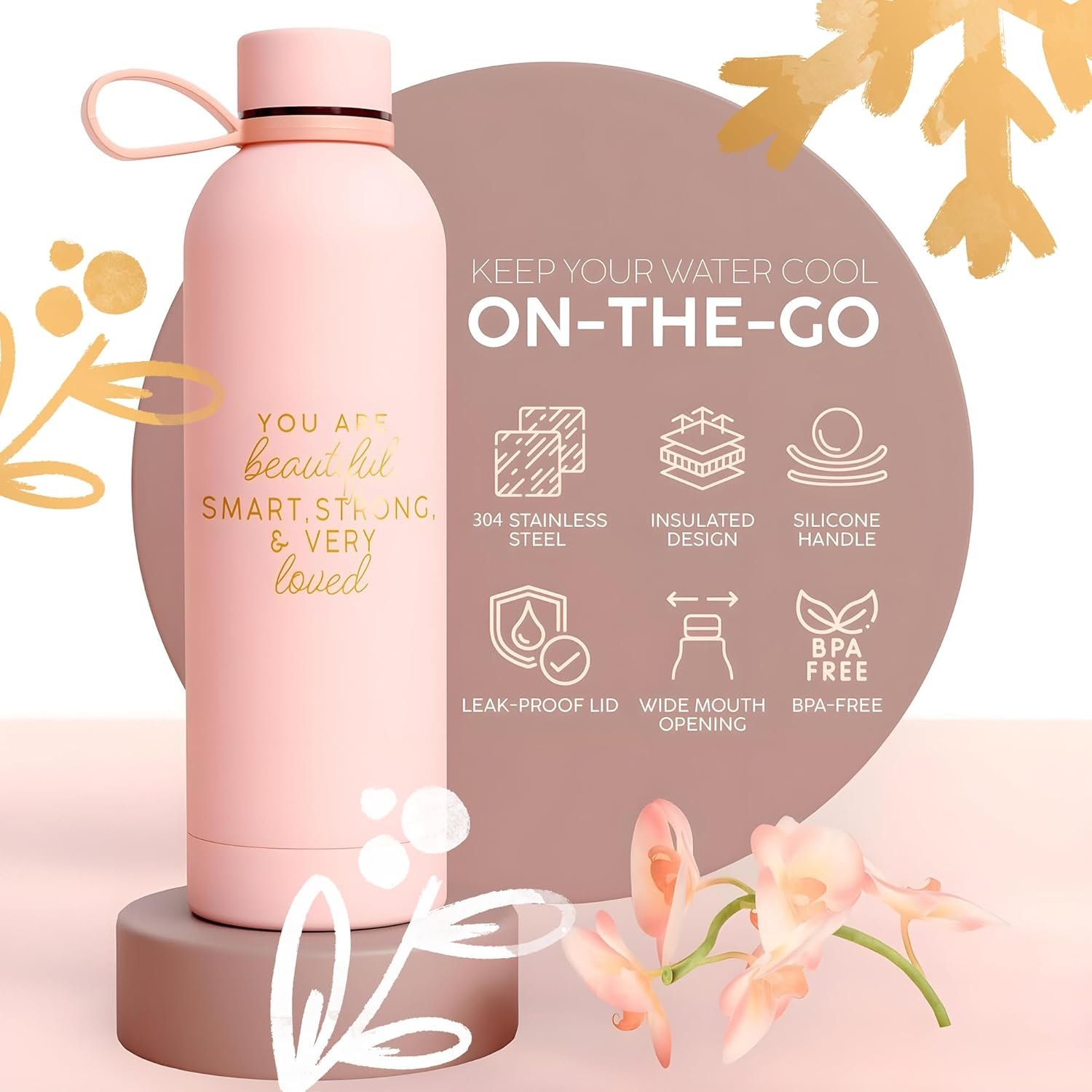 WITH COMFY SOCKS & HIGH QUALITY WATER BOTTLE: Made of sturdy stainless steel, our water bottle keeps drinks cool on the go with a leak-proof lid, perfect for summer outings. Featuring an uplifting quote, “You are beautiful, smart, strong & very loved”, brings her smile & happy mood every day. Plus, it is paired with cozy socks, transforming your loved one’s routine into a rejuvenating ritual with every use.