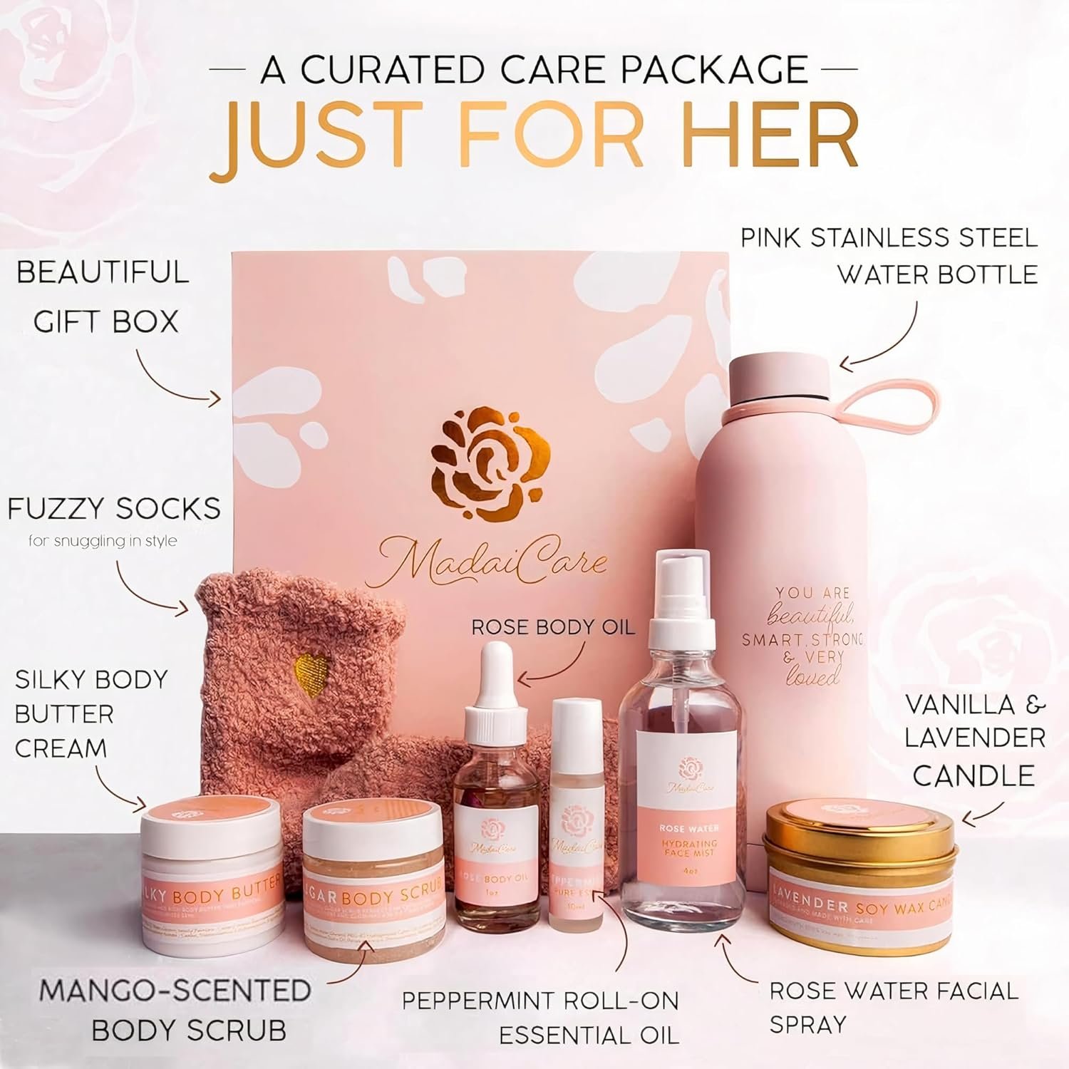 THE ULTIMATE SPA GIFT SET: Pamper yourself or a loved one with Madai Care’s luxurious spa gift set for women. This premium set includes cozy socks, exfoliating body scrub, hydrating mango body butter cream, soothing vanilla and lavender-scented candles, refreshing facial mist, nourishing body oil, invigorating roll-on peppermint, and a stylish insulated water bottle.