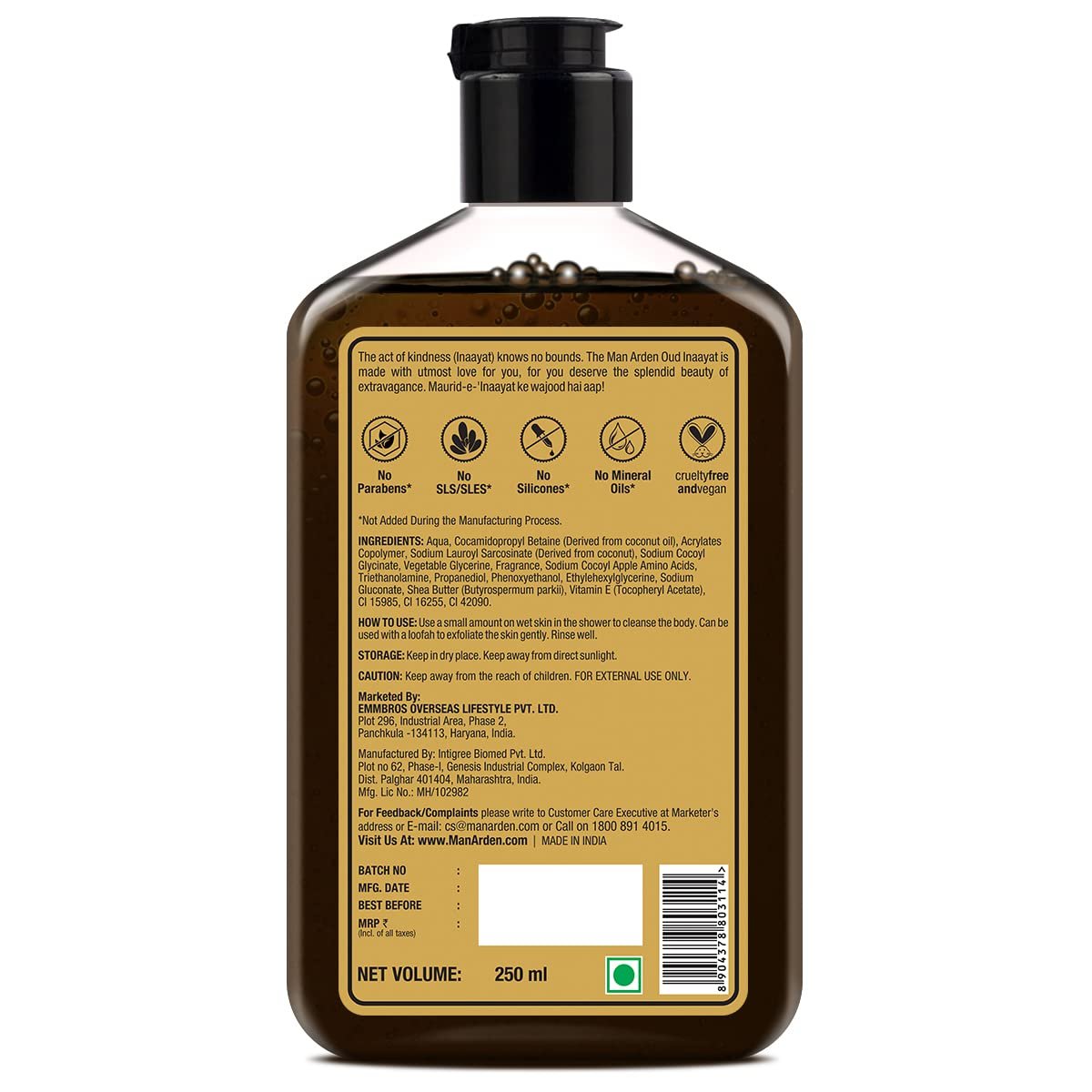 Cruelty-free: Man Arden Oudh Inaayat requires no testing or experimenting on animals. Our belief in peaceful co-existence and a relaxing shower experience as offered by Inayat is exemplified by two words: cruelty-free.