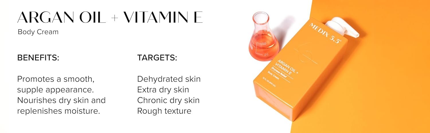 DRYNESS RELIEF – Medix 5.5 Argan Oil + Vitamin E Dryness Relief Body Moisturizer Cream is the perfect choice for anyone looking to improve the overall health and appearance of their skin. Infused with powerful active ingredients like Argan Oil, Shea Butter, Vitamin E, Sacred Lotus, Green Coffee Bean Oil, Aloe Vera, & Fruit Extracts, which all work together to help reduce the look of wrinkles, fine lines, cellulite, sagging skin, & blemishes to promote smooth, firm, and healthy looking skin.