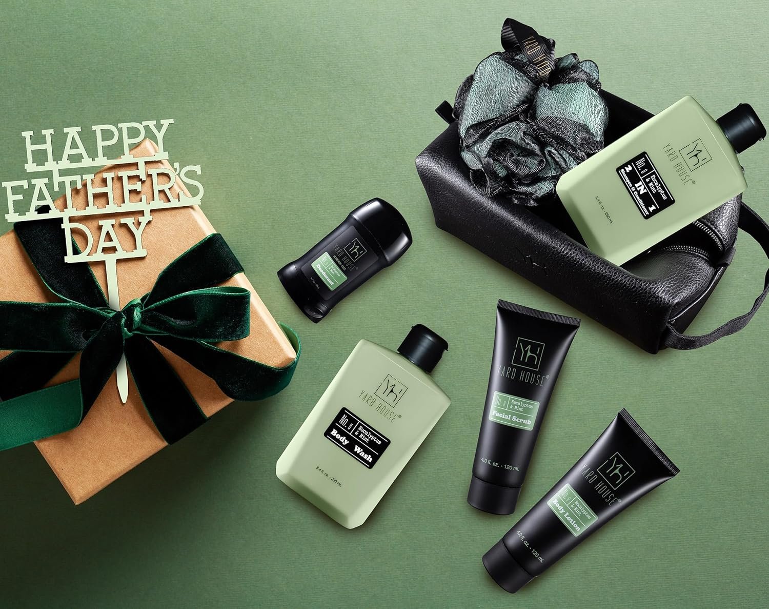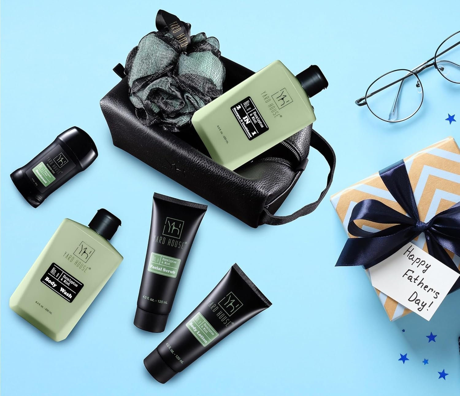 COMPREHENSIVE GROOMING GIFT SET FOR MEN: Equipped with body wash, facial scrub, body lotion, 2-in-1 shampoo and conditioner, deodorant, a premium shower pouf and a luxury faux leather toiletry bag / dopp kit. Each product is generously sized and infused with the invigorating scent of eucalyptus and mint for a complete grooming experience.