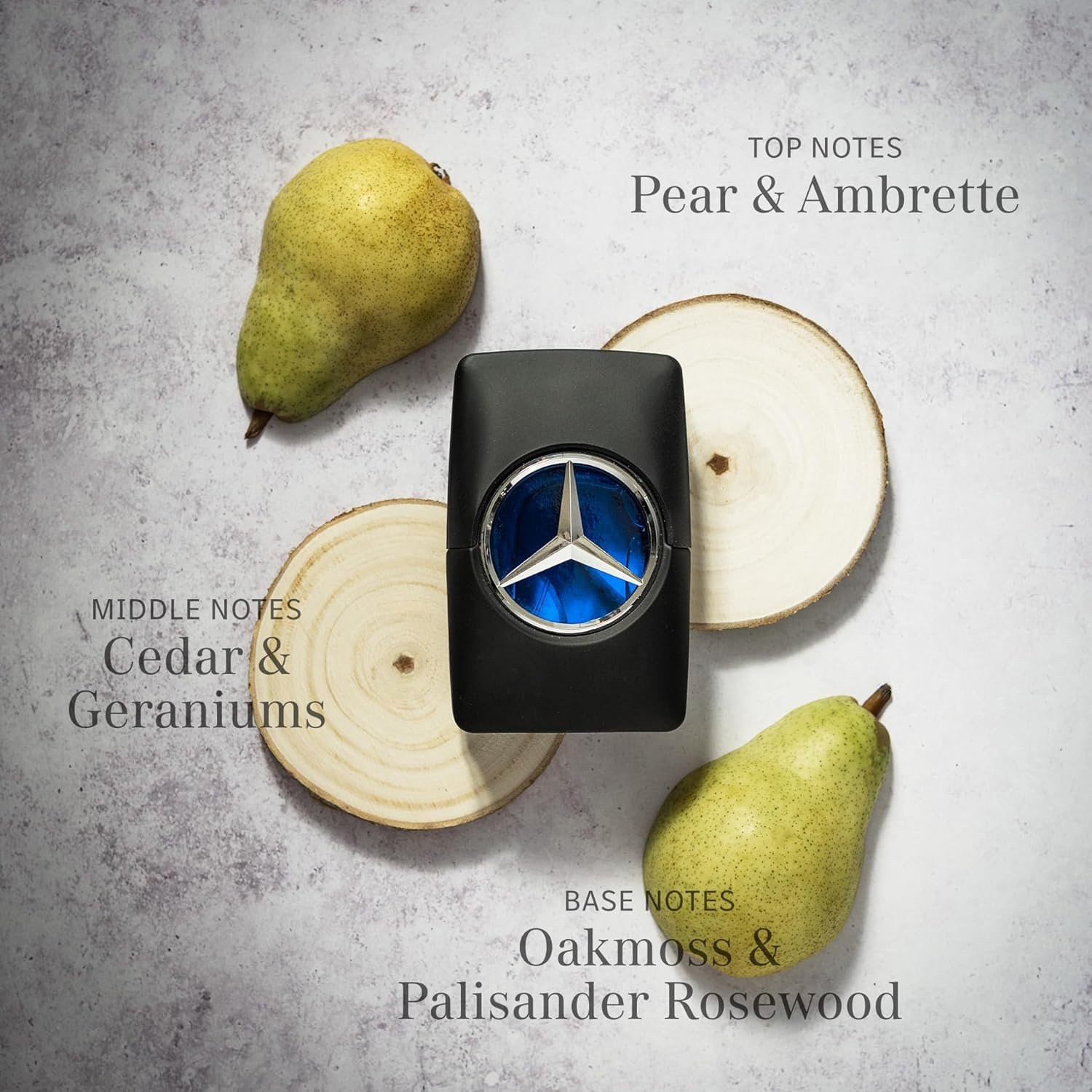 A SOFT YET ENTICING BLEND. Mercedes-Benz Man arrives with top notes of fruity-yet-sophisticated Pear and Ambrette Seeds, easing into a center of fresh floral Geranium, and drying to a woody, musky base, infused with earthy Rosewood and Oak Moss.