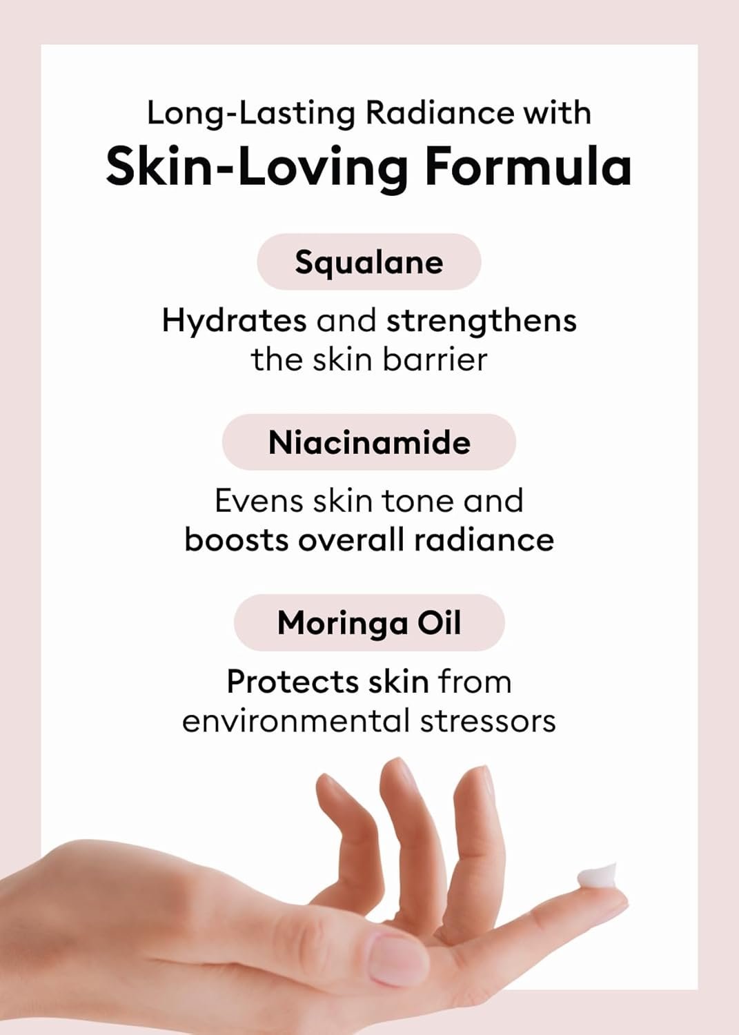 Key Ingredients: Patented Moringa Oil hydrates and protects against environmental factors. Mannan quickly absorbs to moisturize and soften the skin. Squalene helps retain moisture and enhances overall skin health.