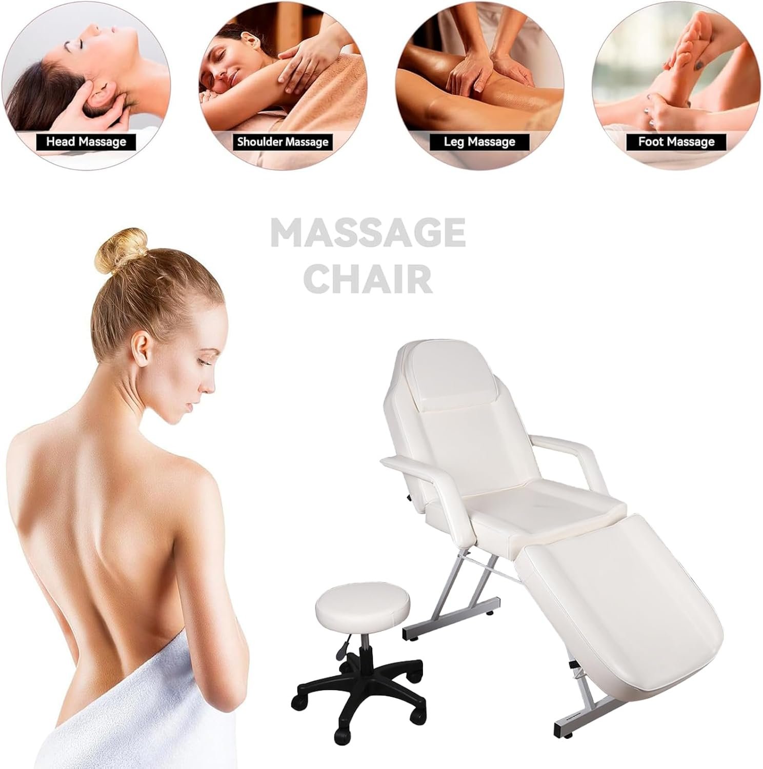 Material: Steel Frame/PVC Leather/SpongeColor: WhiteBed Adjustable: Backrest 0° – 65° incline upward & Footrest 0° – 70° downward declineStool Height Adjustment: 18″ – 24.5″Bed Dimensions: 72.8″(L) x24.4″(W) x 27.6″(H)Stool Dimensions: 19″(L) x 19″(W) x (18-24.5)”(H)Weight Capacity: 330lbs/150kgBed Weight: 49.6lbStool Weight: 7.72lb
