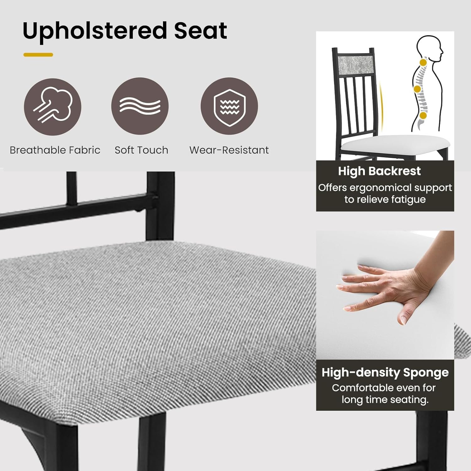 【High-Back Upholstered Seat】The faux marble dining table set for 4 conforms to the ergonomic design, with 4 dining chairs set offers strong support to relieve back fatigue. The high-density sponge and breathable fabric on the dining seat is soft, rejects stuffy for comfortable sitting.