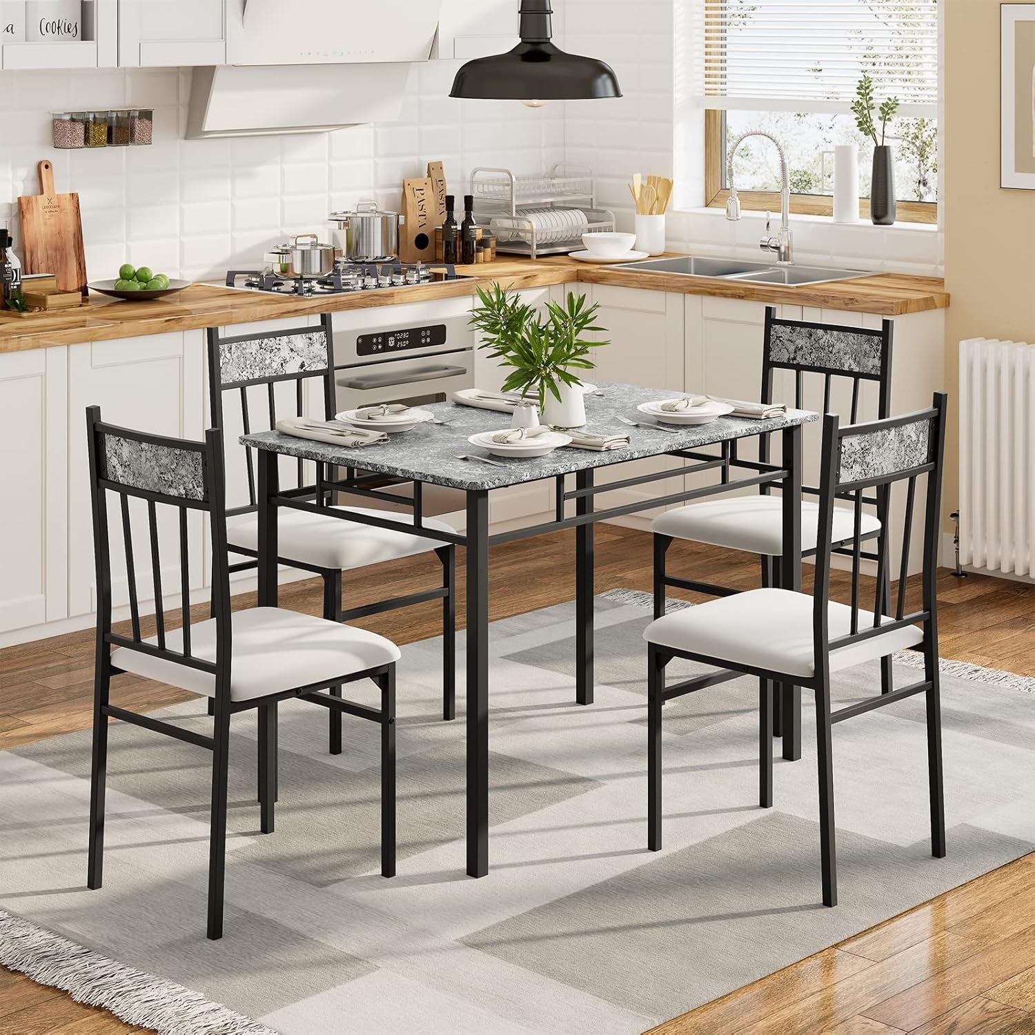 【Durable Sturdy Structure】Thickened E2 MDF board and robust metal frame make the table and chairs sturdy, durable and stand up to daily wear-and-tears, easy to clean after use. The kitchen table set with non-slip rubber feet also reduce noise and protect your floor from scracthes.