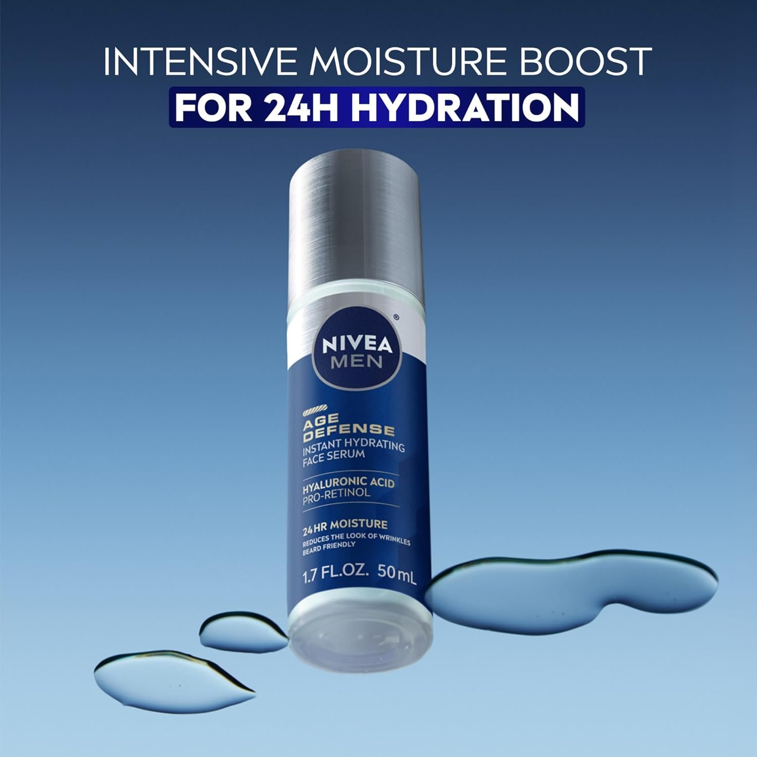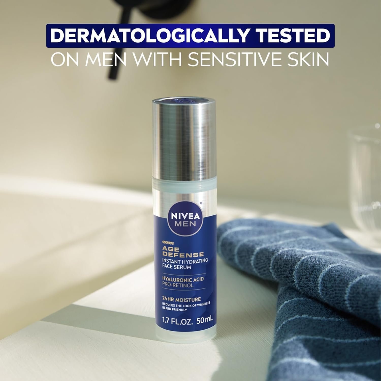 NIVEA MEN Age Defense Instant Hydrating Face Serum for Dry Skin, With Pro-Retinol and Hyaluronic Acid, Facial Serum Helps Reduce Look of Fine Lines and Wrinkles, 1.7 Fl Oz Bottle