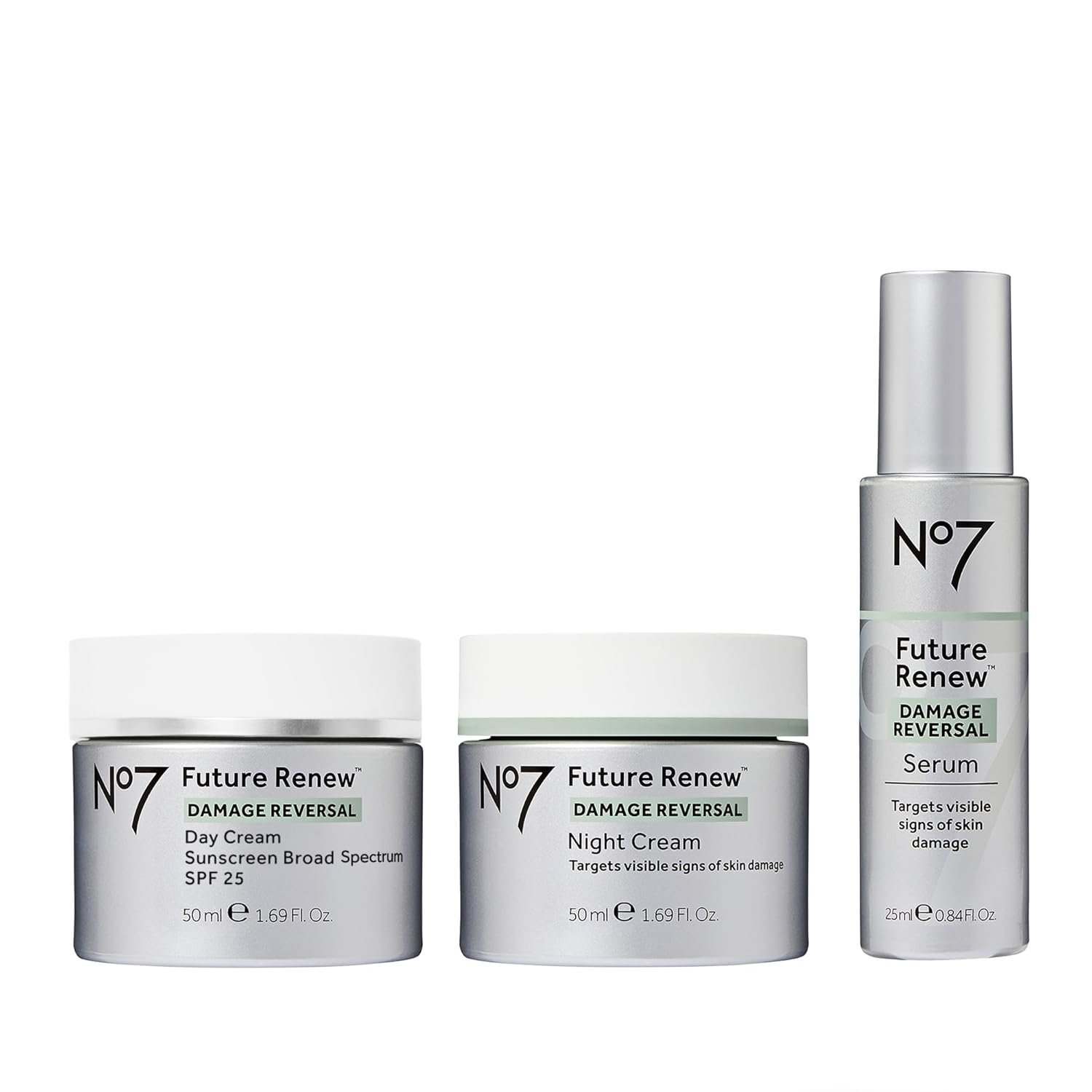 What’s Included – This skin care set features No7’s Future Renew Damage Reversal Face Serum, Future Renew Damage Reversal SPF 25 Day Cream & Future Renew Damage Reversal Night Cream, all working in their own ways to reverse visible signs of sun damage.