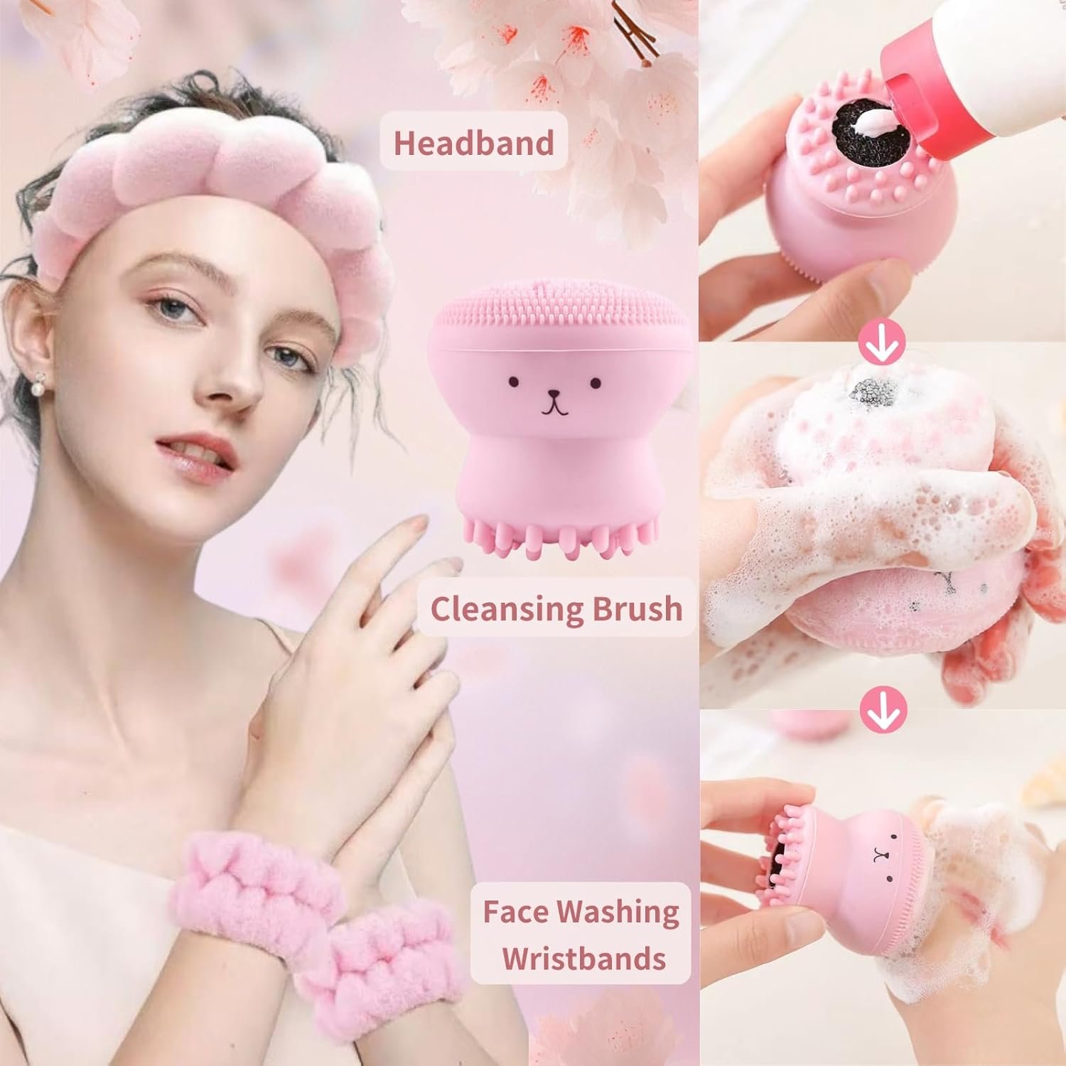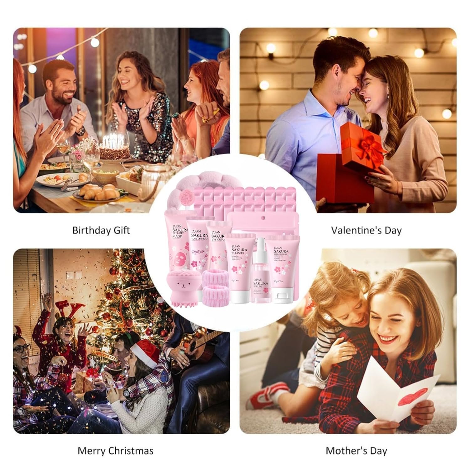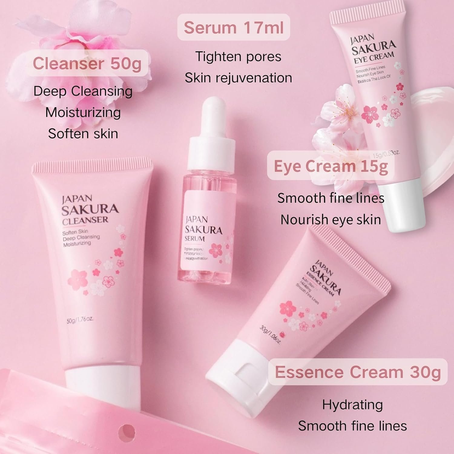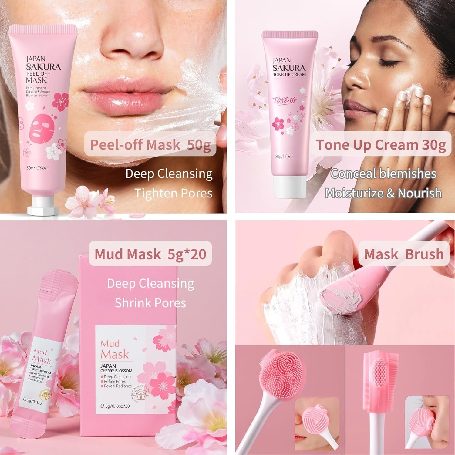 【Complete Skincare Kit】This Japan sakura skin care set contains a cleanser, serum, essence cream, tone up cream, eye cream, peel-off mask, mud mask, mud mask brush, headband, and wristband. Everything you need for a comprehensive skin care routine kit for women is right here in one skincare set.