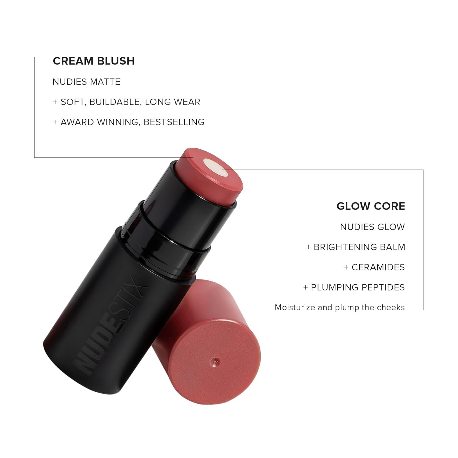 WHAT IT IS: A multi-tasking matte cream blush stick with an innovative juicy glow core for easy radiant blush color on cheeks, *eyes and lips. NUDIES MATTE + GLOW CORE is an all-over-face natural blush color with inner glow dewiness formulated with skin-loving ceramides and plumping peptides, to-go. Skin gets a Nude Blush Glow for an easy blush sculpt on cheeks, *eyes and lips with a lit-from-within luminosity.