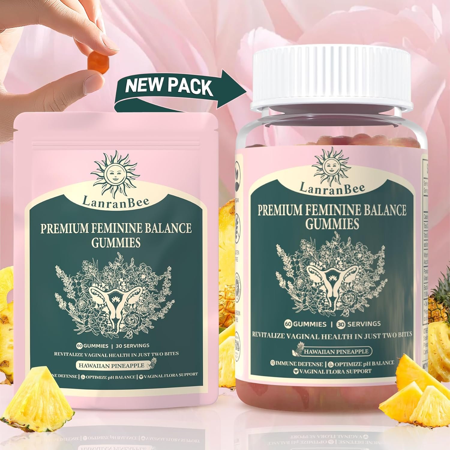 Premium Feminine Balance Gummies – for Women’s Health & Wellness – Immune Support – Vegan, Gluten-Free & Halal – Hawaiian Pineapple – 60 Gummies – 30 Servings (1)