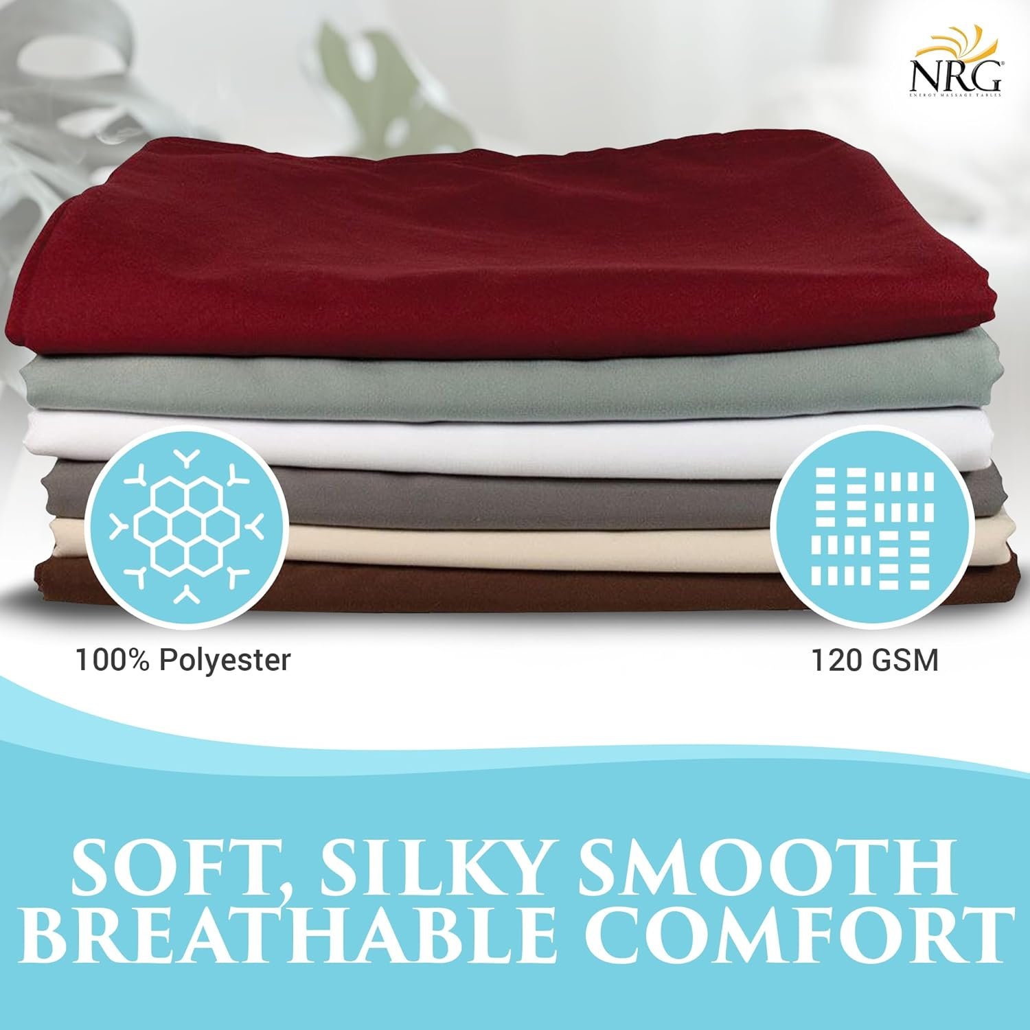 Highlights Premium Microfiber Massage Table Sheet Set 3 Piece Set by NRG Resists Pilling & Wrinkles 120 GSM Multiple Color Options 100% Double Brushed Polyester 3 Piece Set Includes Face Cradle Cover, Flat Massage Sheet and Massage Table Fitted Sheets