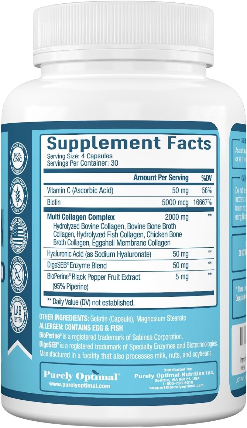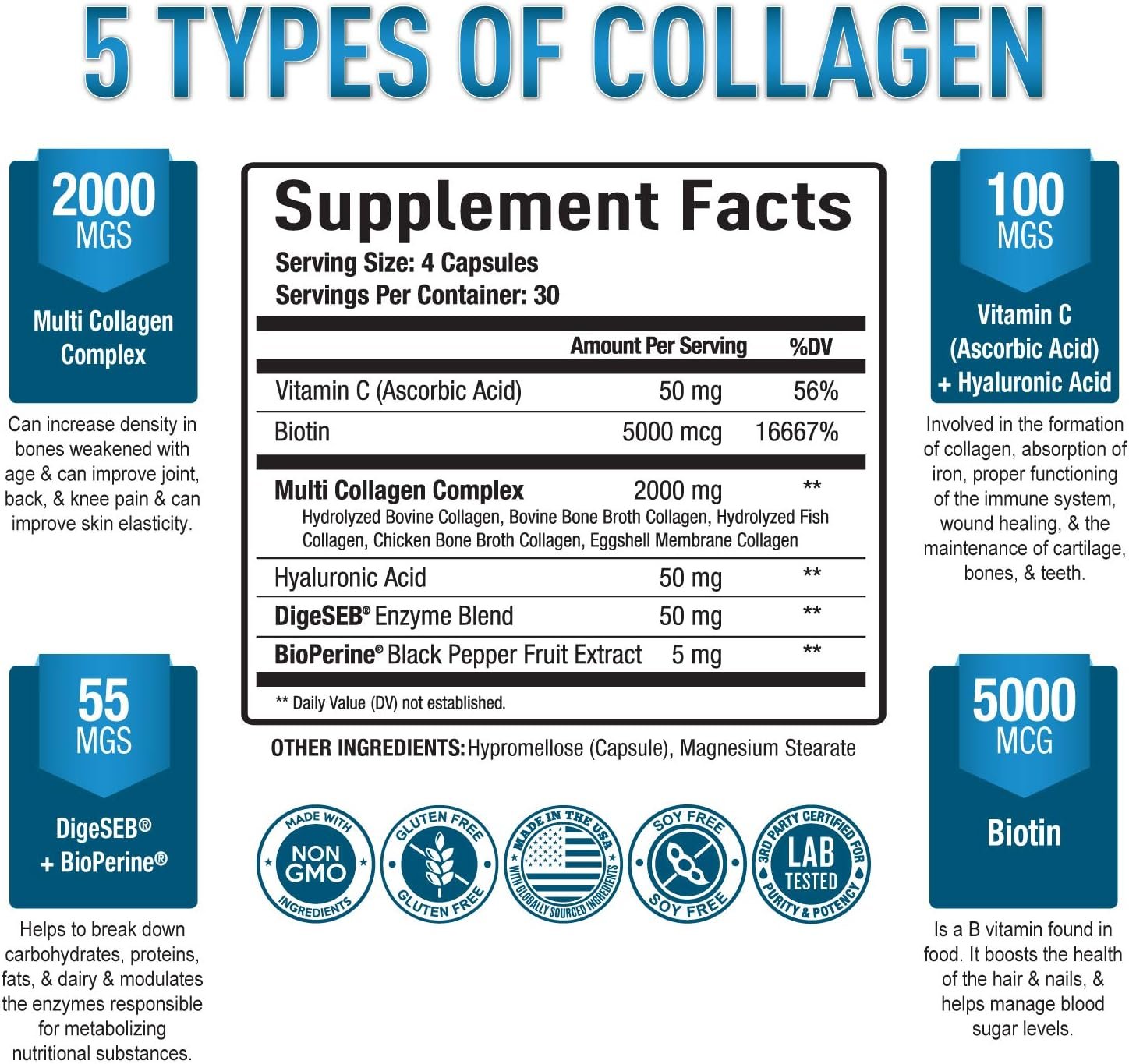 Collagen Peptides for Hair, Skin, Nails: They say beauty is skin deep, so keep your skin healthy by providing collagen deep within! Collagen peptides are the proteins that give your skin elasticity, firmness, and hydration. They are the building blocks of keratin, an essential protein for nail & hair growth. Along with biotin, collagen strengthens & protects them from damage. With 2000mg of collagen per serving & all 5 main types your body needs, our supplement is truly your beauty in a bottle!