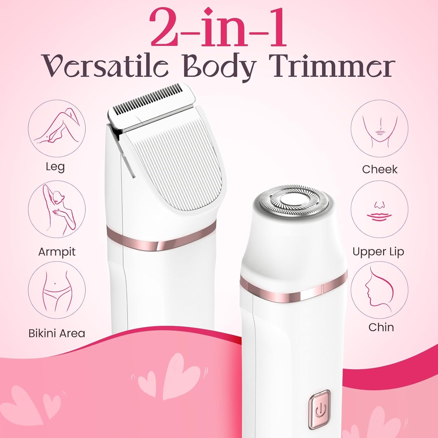 đă2-in-1 BIKINI TRIMMERăSay hello to versatility with the Risina bikini trimmer for women. Featuring two efficient shaving heads, itâs perfect for tackling hair on various parts of your body. The body shaver head is ideal for arms, legs, and bikini areas, while the facial shaver head takes care of cheeks, chin, and upper lip.