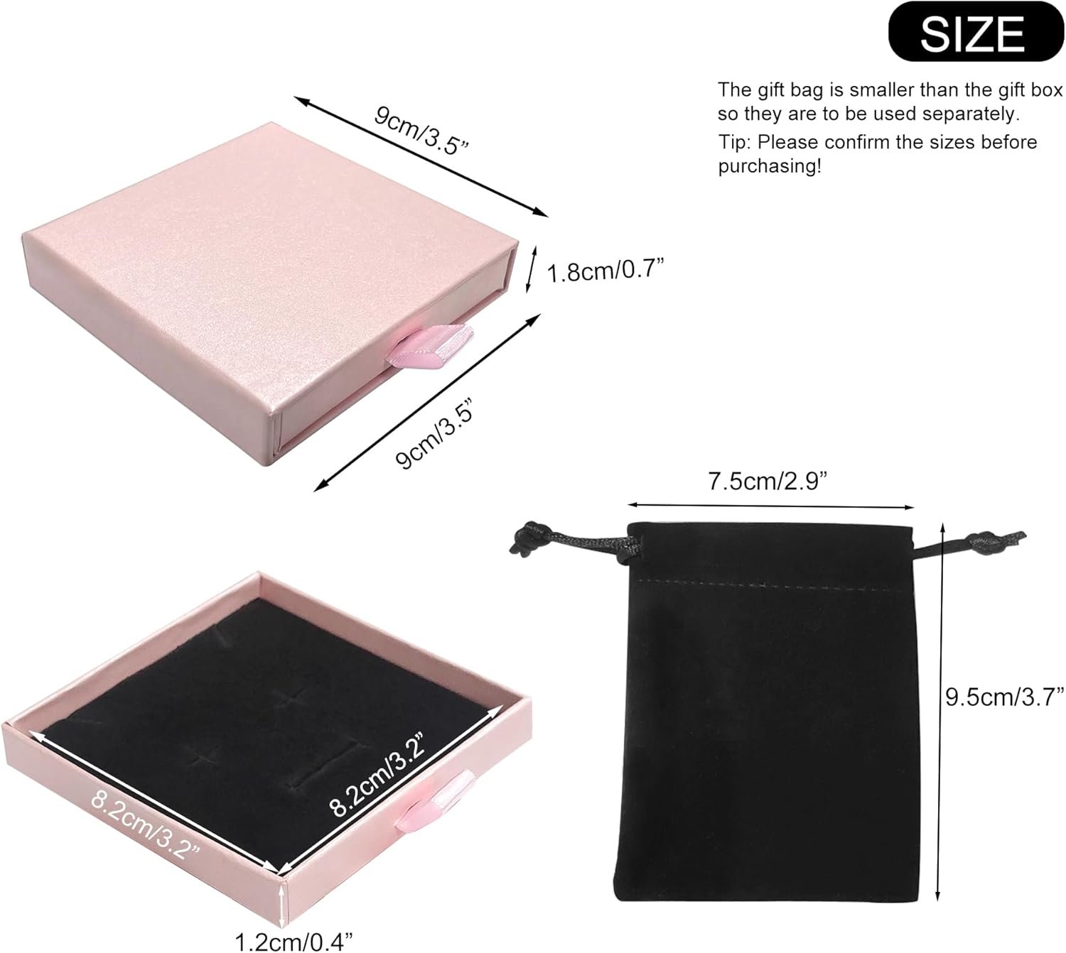 Jewellery Gift Box Outer Size: 9 x 9 x 1.8 cm; Inner Size: 8.2 x 8.2 x 1.2 cm. Velvet Jewellery Bag Size (Slightly Smaller Than The Box): 9.5 x 7.5 cm. Tip: Please confirm the sizes before purchasing!
