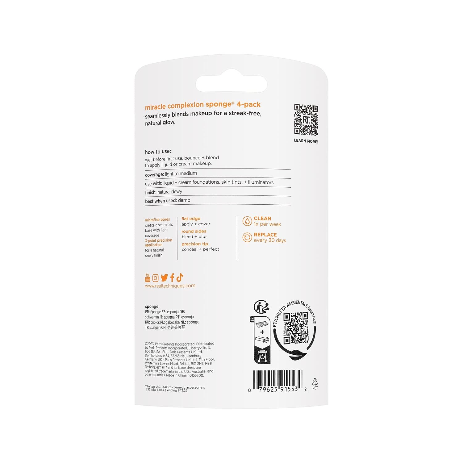 The Real Techniques Miracle Complexion Sponge flawlessly blends liquid and cream products with ease for a streak-free, luminous glow. Our best-selling makeup sponge offers a natural, dewy finish, and its micro-fine pores help create a seamless base with light to medium coverage. Real Technique’s makeup blending sponge works best with liquid and cream makeup products such as foundation, skin tints, and illuminators. This makeup sponge has RT’s unique 3-point application technique that makes blending products seamless. First use the flat edge of the makeup blender sponge to pack on product, then the precision tip to conceal, and finally, blend it all out with the rounded side. Use it damp for extra dewiness and let that inner glow shine through. The Miracle Complexion Sponge is easy to clean using our Real Techniques Brush + Sponge Cleansing Gel. It’s also 100% cruelty-free, vegan, and designed with revolutionary latex-free foam technology. We are Real Techniques, the brand of choice for all makeup users, no matter your level of expertise. Created in collaboration with leading makeup artists, we aspire to take the mystery out of choosing beauty tools so you can focus more time on putting your best face forward one blend at a time. From full makeup looks, to quick beauty hacks, RT brushes + sponges are exceptionally high quality for professional looking results every time. BUT… don’t be fooled by our affordable prices, RT tools are award-winning + purposefully designed because that’s what you deserve. Quality without compromise.