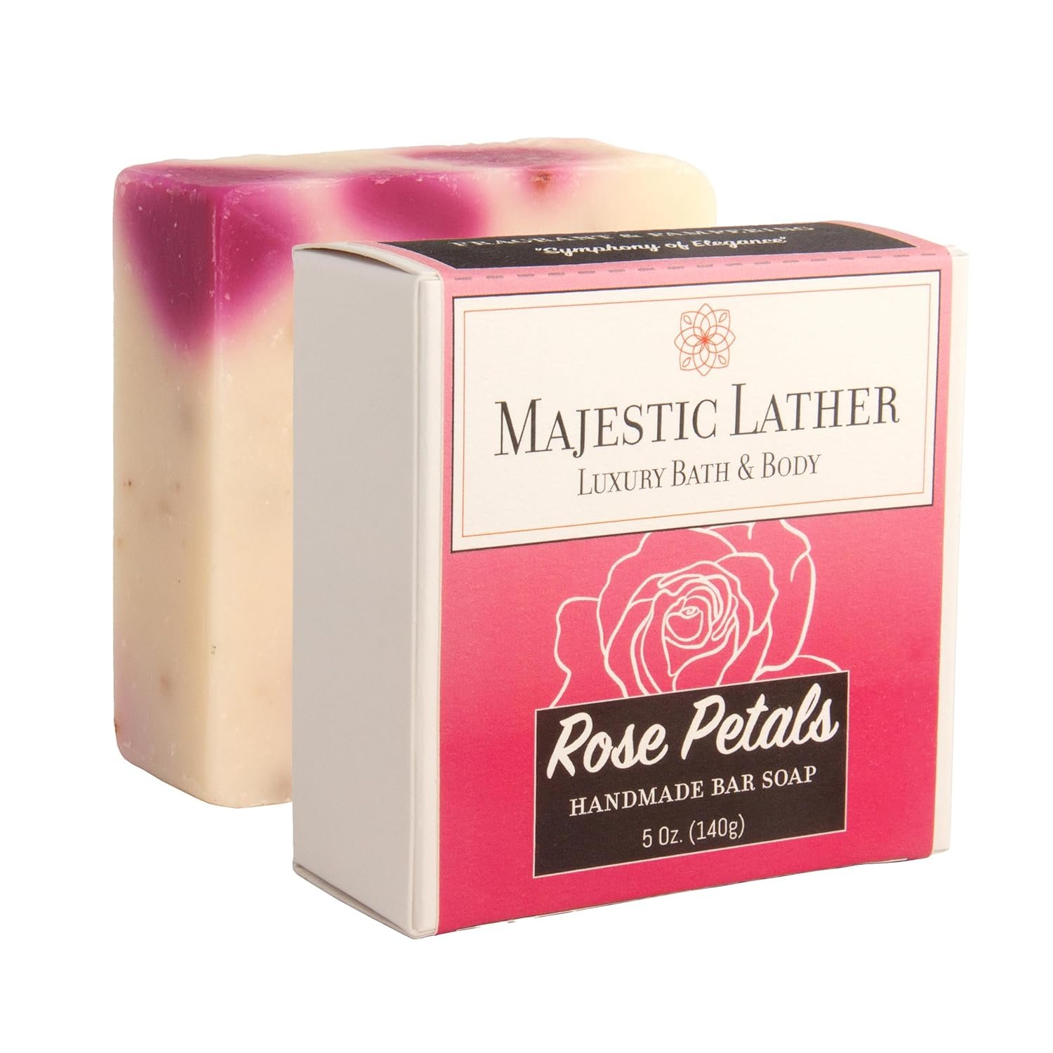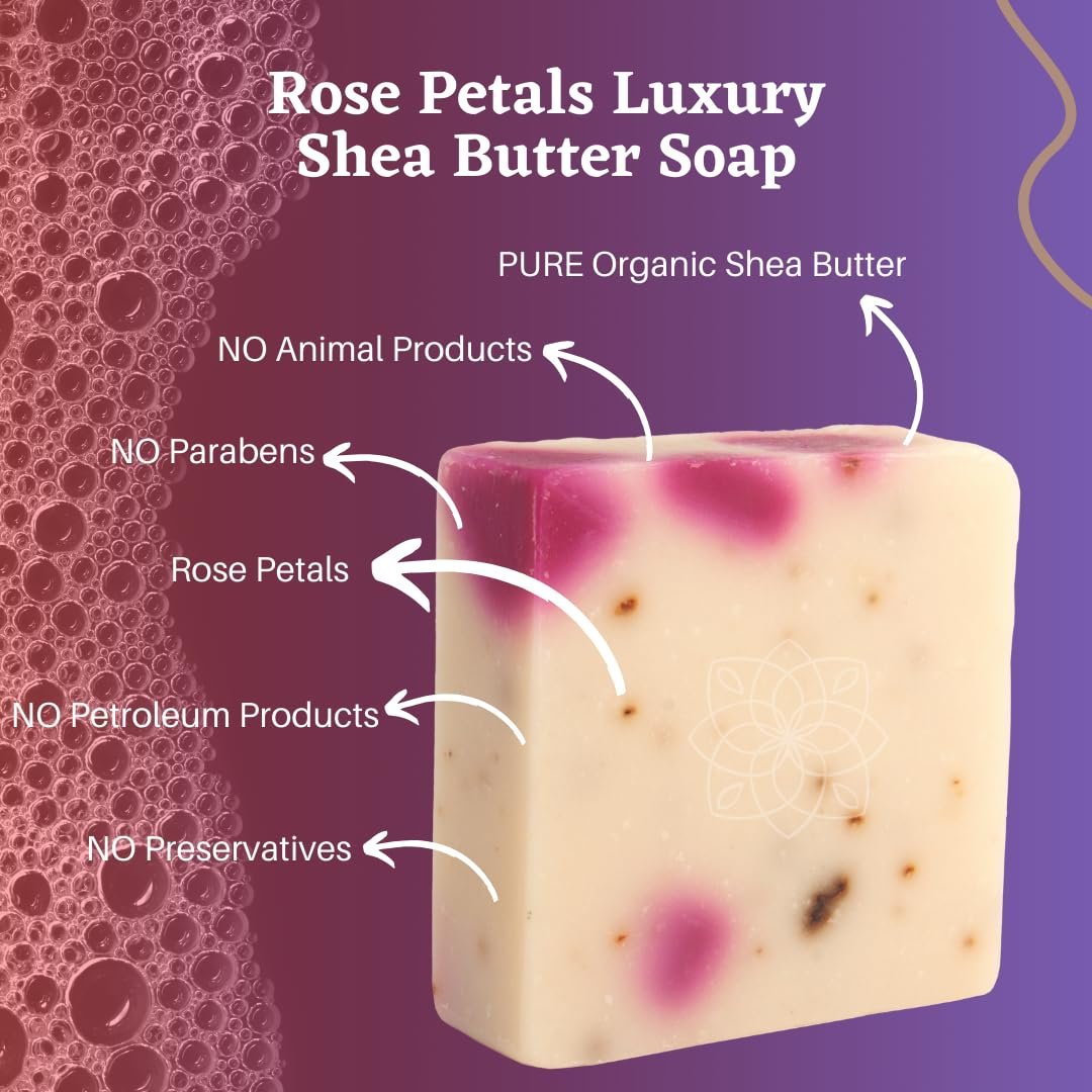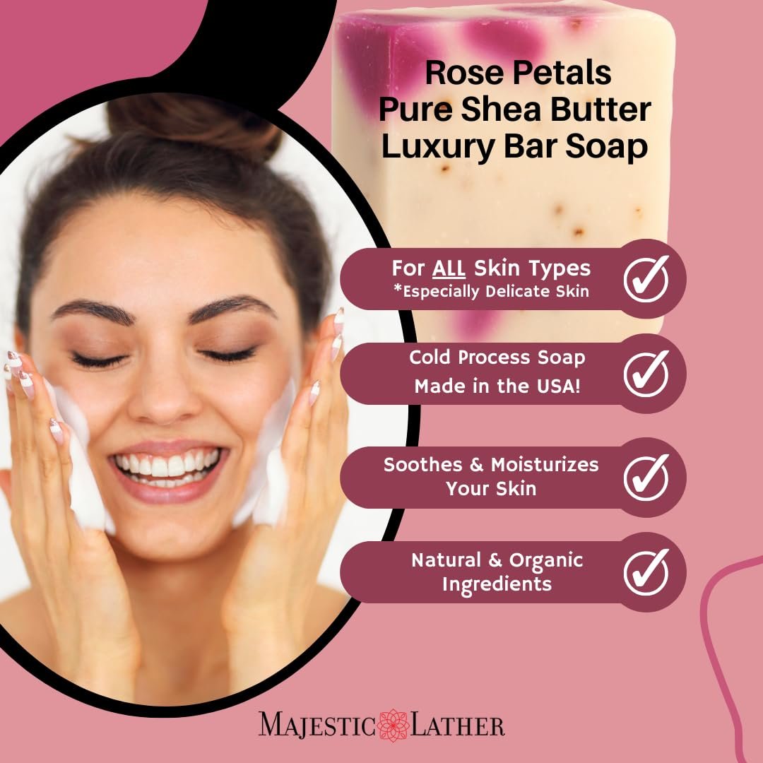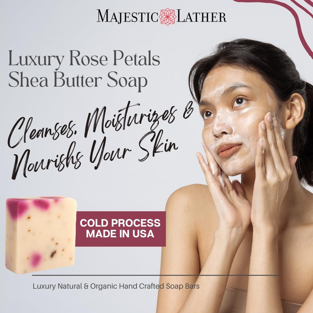 Immerse in Tranquility: Make your daily cleanse a moment of mindful serenity. Allow the stress of the day to melt away as you embrace the soothing, skin nourishing properties of Majestic Lather Rose Petals Luxury Soap. Makes the perfect gift.