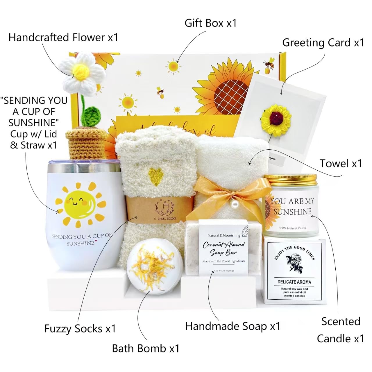 【Unwind and Rejuvenate with Thoughtful Gift Basket】Indulge her senses with a 12oz insulated stainless steel tumbler featuring a whimsical quote, “SENDING YOU A CUP OF SUNSHINE.” Alongside, find soft fuzzy socks, 1 * scented candle,1* Towel, 1* Bath Bomb, 1* Handmade Soap, 1* Handcrafted Flower, a heartfelt greeting card, Each item is meticulously selected to bring joy and relaxation to her day.