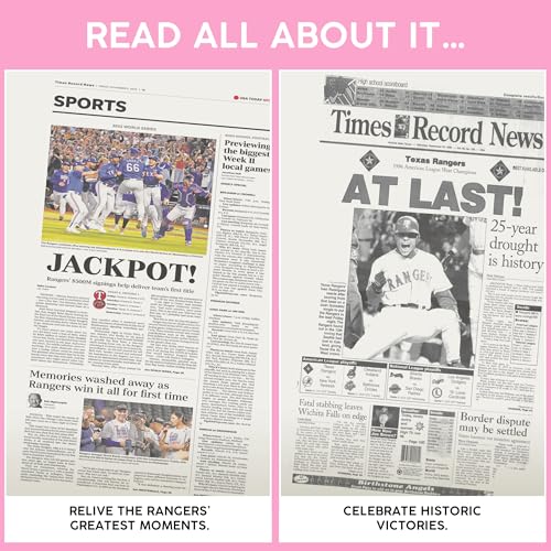 Give the gift of memories with this stunning oversize centerpiece mirroring a tabloid newspaper. Revisit Globe Life Field and beyond in our carefully curated collection of newspaper headlines, pictures, and articles. We’ve used our archive of 2 million+ newspapers to build a picture of the Texas Rangers as reported by Austin American-Statesman and Times Record News writers who witnessed each match.