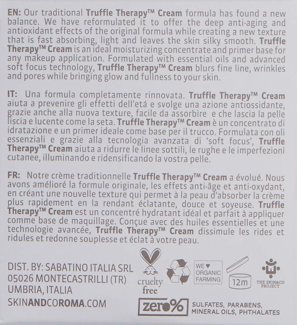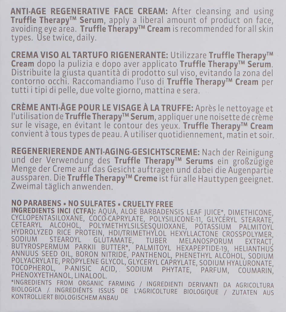 For Radiant Results: Apply a nickel-sized amount of Truffle Therapy Cream to face, neck, and décolleté after cleansing, toning, and using Truffle Therapy Serum. Massage into skin for 30 seconds, then gently press remaining cream using the palms of your hand, to ensure maximum absorption.
