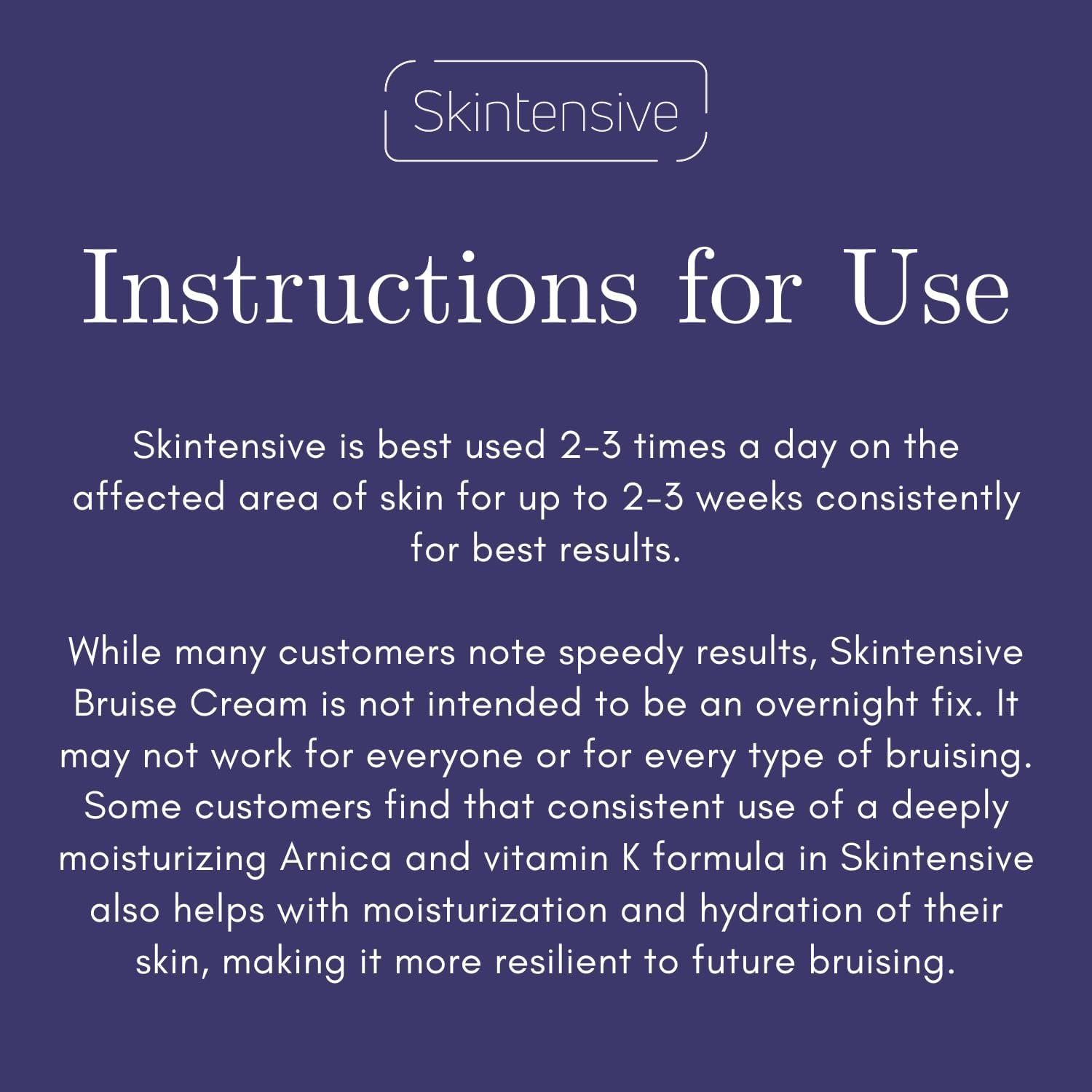 ARNICA and VITAMIN K! Bruises, purpura, cuts, new scars, new stretch marks, and skin cracks – from cuticle moisturizing to sun damage relief, Skintensive’s non-greasy formula gives your skin the loving attention it deserves.