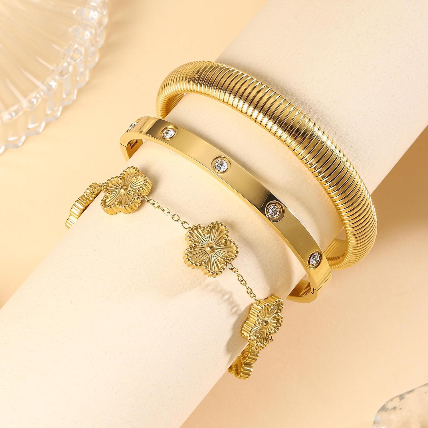 The stacked design of these gold bracelets is simple yet bold, making them very suitable for daily wear. 18k gold plating, shining from every Angle. Elegant and graceful, these women’s gold bracelets can be worn alone or stacked to match different outfits and moods.