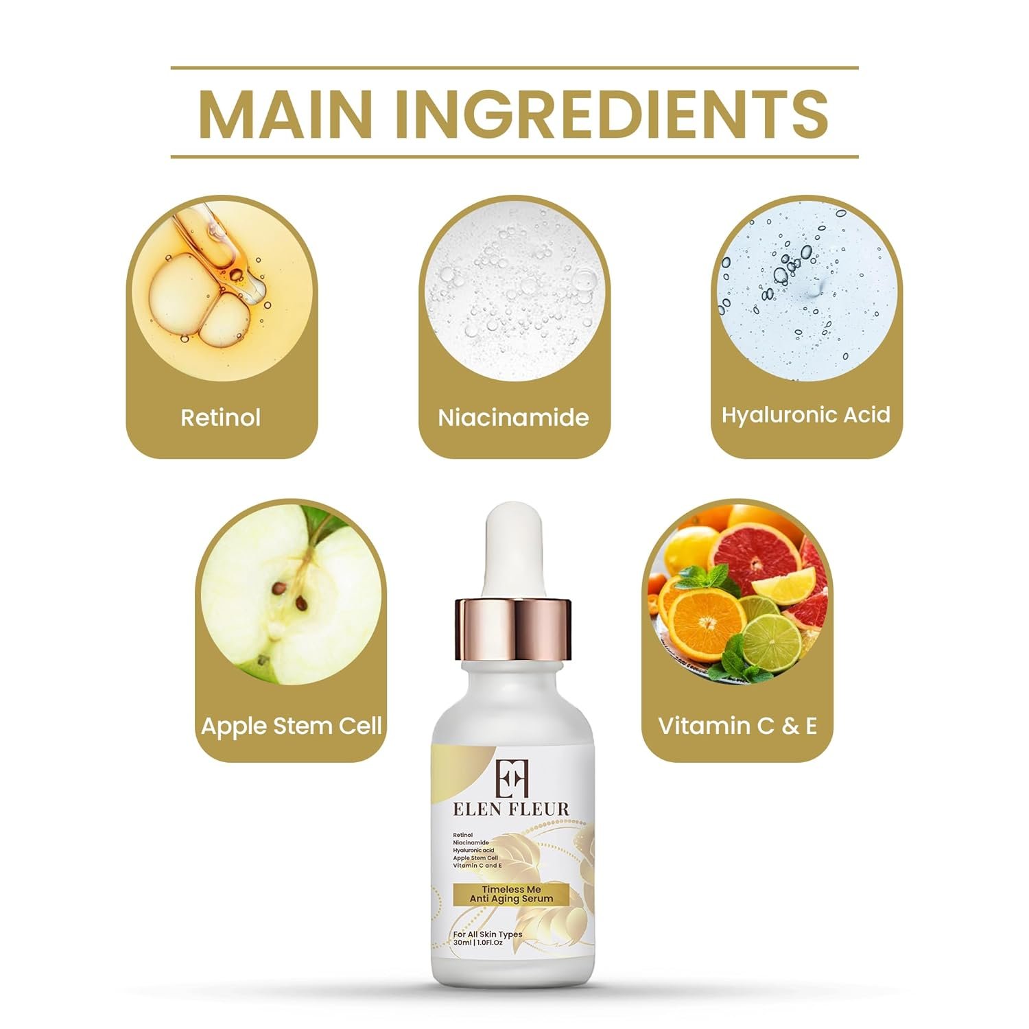Retinol (Vitamin A) smooths wrinkles, resurfaces skin texture, and accelerates cell turnover.Apple Stem Cell Extract promotes skin regeneration at the cellular level, protecting longevity of your skin cells.Niacinamide (Vitamin B3) tightens pores, evens tone, and reduces inflammation.Vitamin C (Ethyl Ascorbic Acid) brightens dullness, fades dark spots, and protects collagen.Hyaluronic Acid locks in 24-hour hydration and plumps fine lines.Vitamin E calms, heals, and defends against environmental damage.
