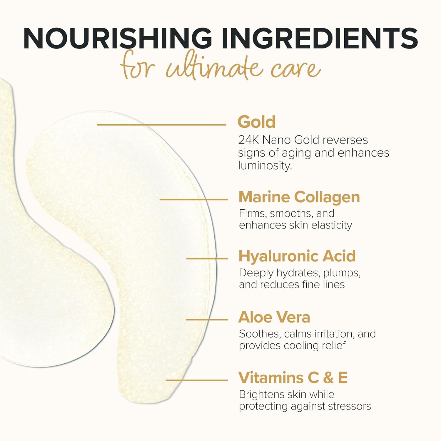 NUTRIENT PACKED. EYES collagen gel masks are micro-infused with a combination of hyaluronic acid, natural high-density marine collagen, enzymes, amino acids, natural marine minerals, trace elements, proteins and vitamins C & E.