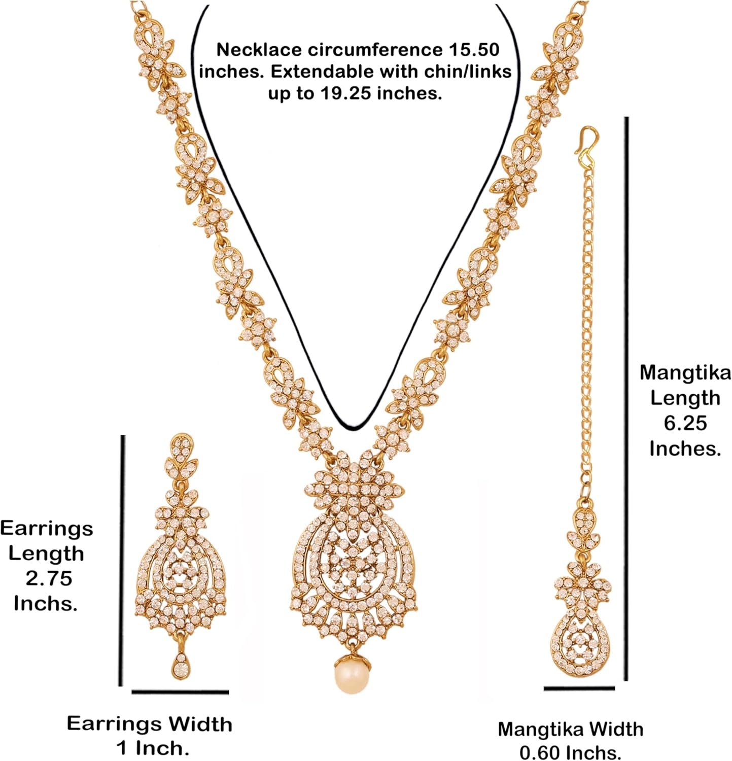 Alloy metal, stylish and pretty Indian style necklace set with beautiful long earrings and Mangtika. Comes with rhinestones in antique gold tone.