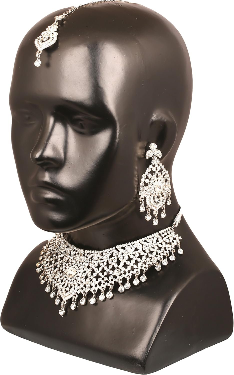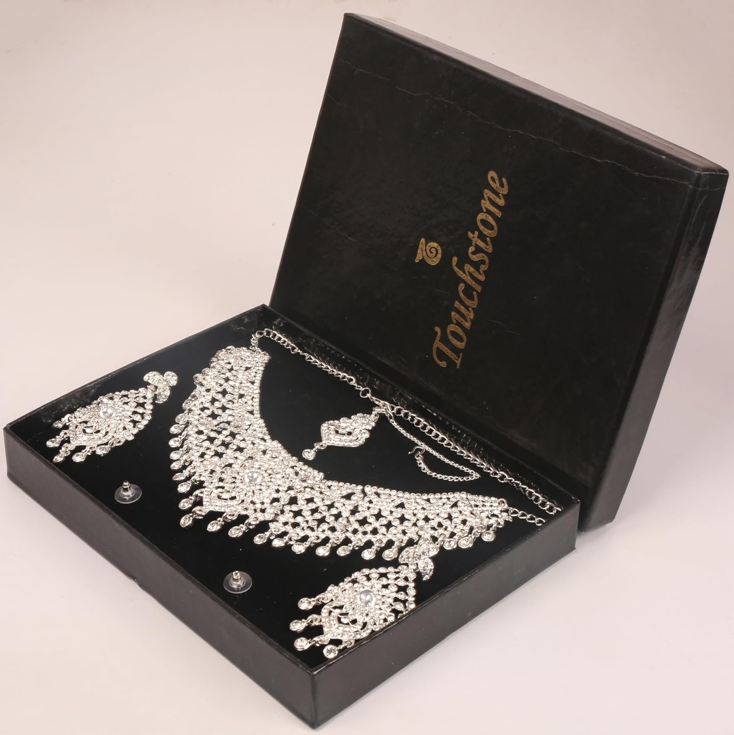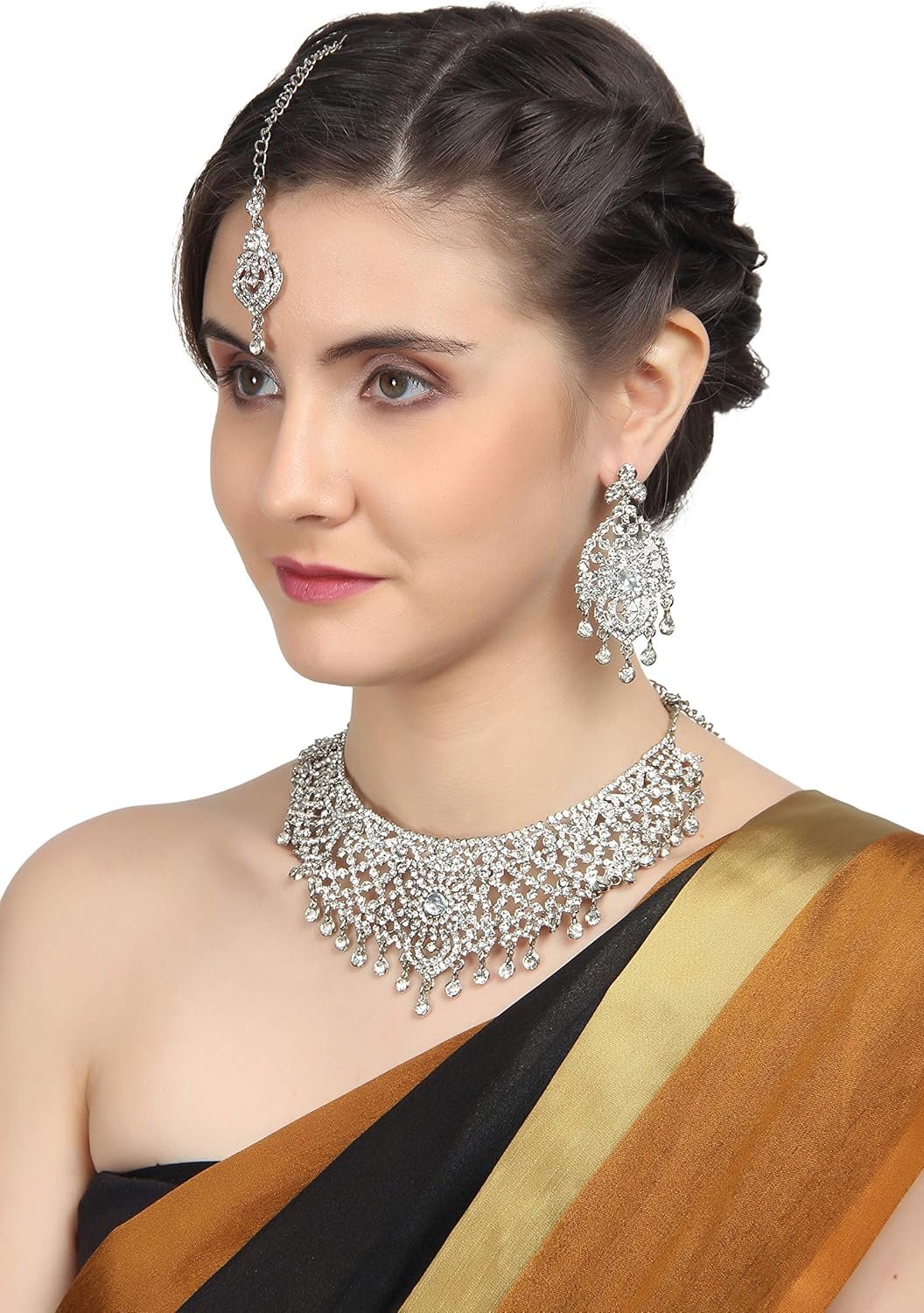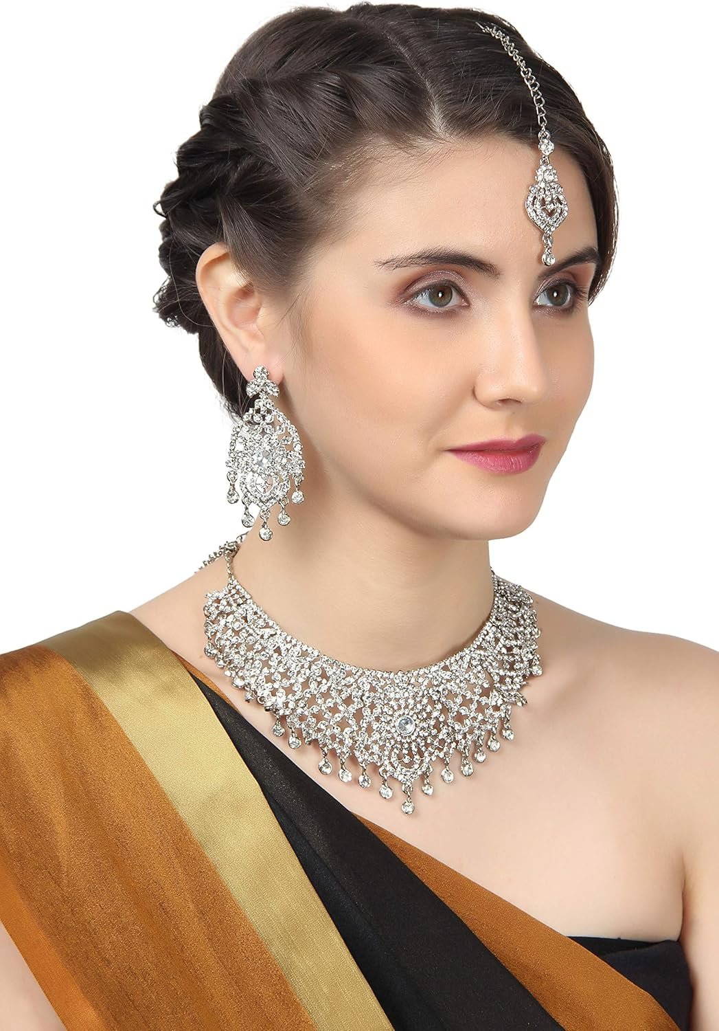 Be the first to review “Touchstone Indian Bollywood Masterly Created Sparkling Rhinestones Studded Look Grand Bridal Jewelry Necklace Earrings Mangtika Set In Silver or White or Gold Tone For Women.”