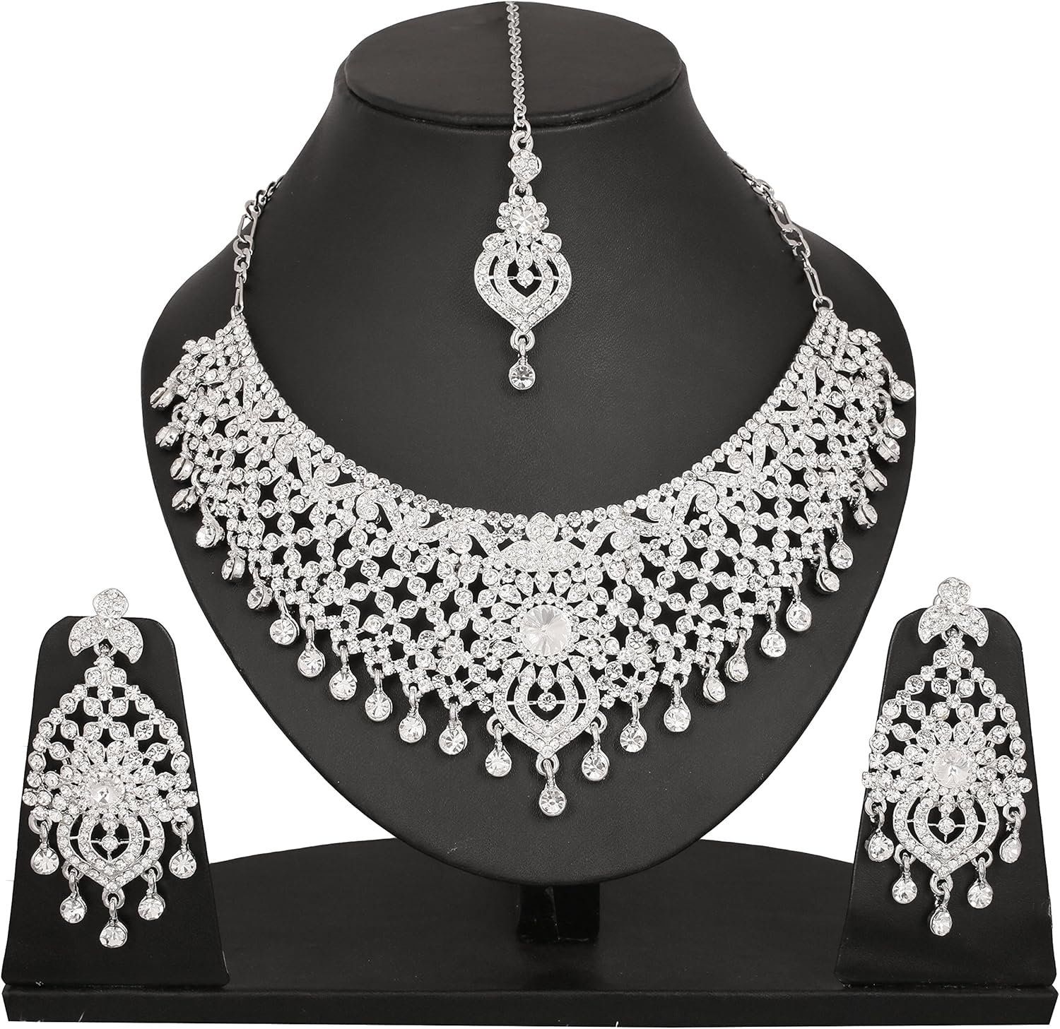 Touchstone Indian Bollywood Masterly Created Sparkling Rhinestones Studded Look Grand Bridal Jewelry Necklace Earrings Mangtika Set In Silver or White or Gold Tone For Women.