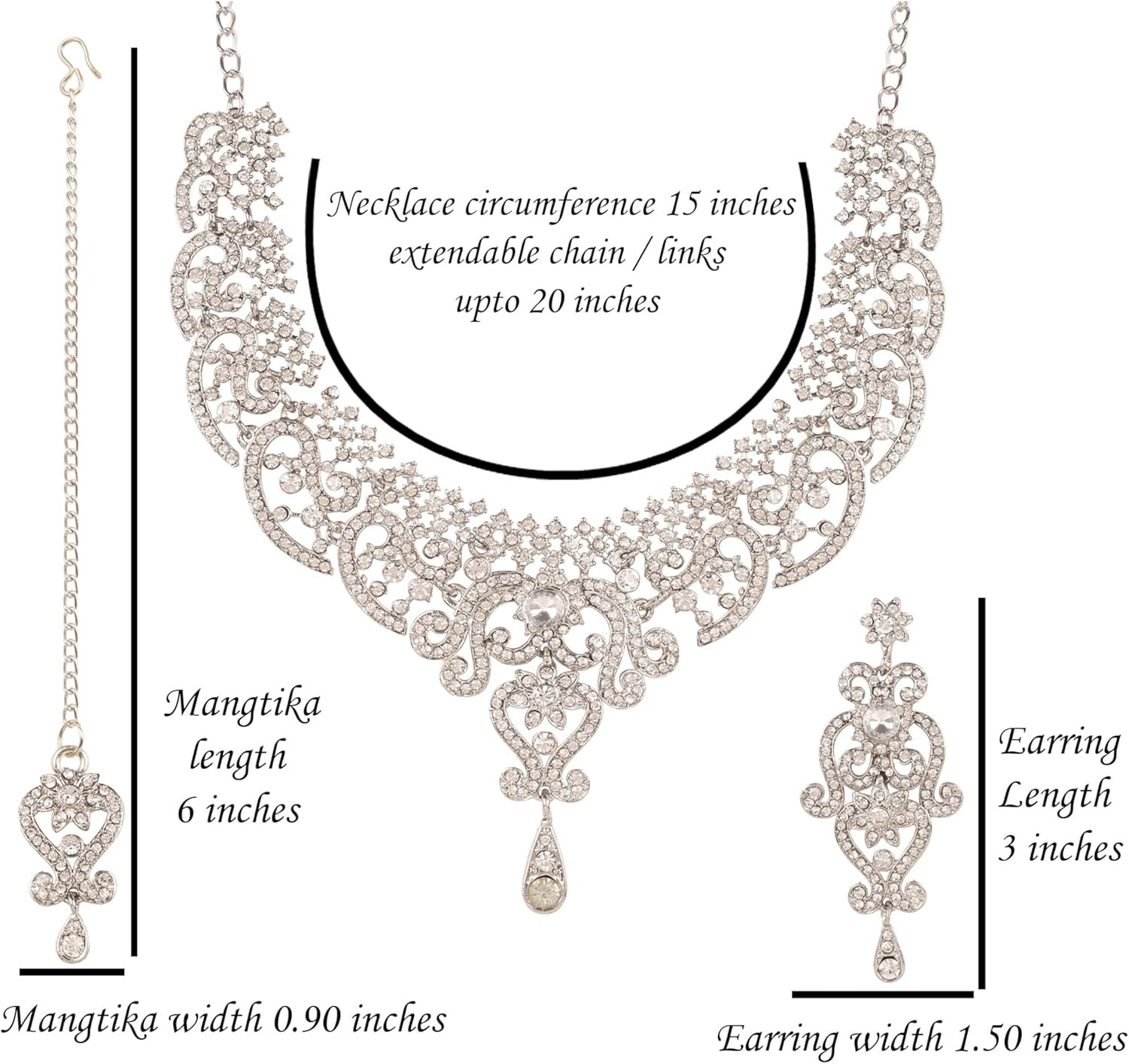 Alloy metal, very exotic, rich and stylish, traditional Indian bridal necklace set, with beautiful danglers and Mangtika embellished with white crystals in silver tone
