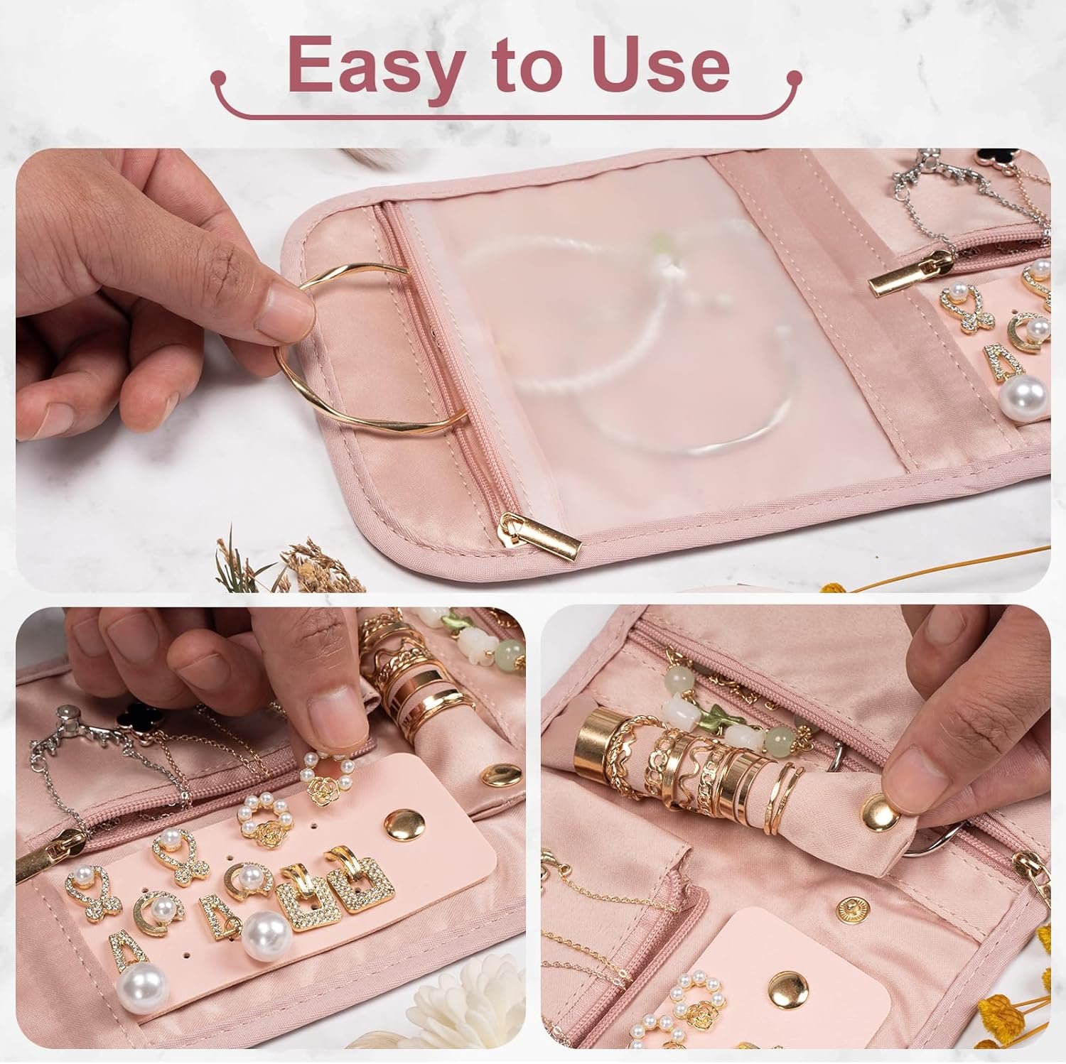 PROTECT JEWELRY: The area of the jewelry keeper has a protective design that prevents jewelry from falling out of the bag and keep it safe. And there are more useful zippered pockets to place to place whatever you need