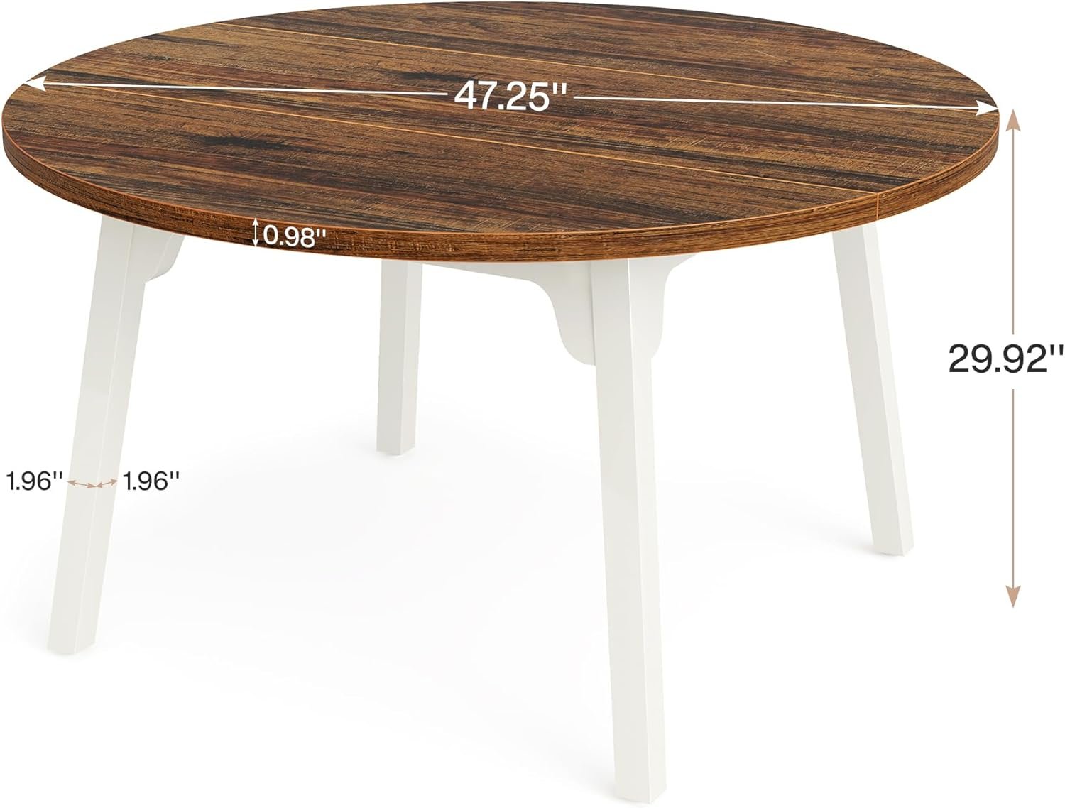Safe Material: E0-Grade MDF + Solid Wood Legs Dimensions: 47.2″ W x 47.2″ D x 29.9″ H Color: Rustic Brown and White Product Weight: 65 lb Bearing Capacity: Up to 350 lb What’s Included: 1 x Dining Table, Hardware, and Assembly Instruction