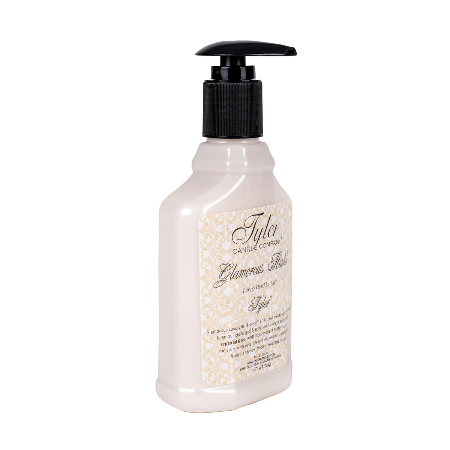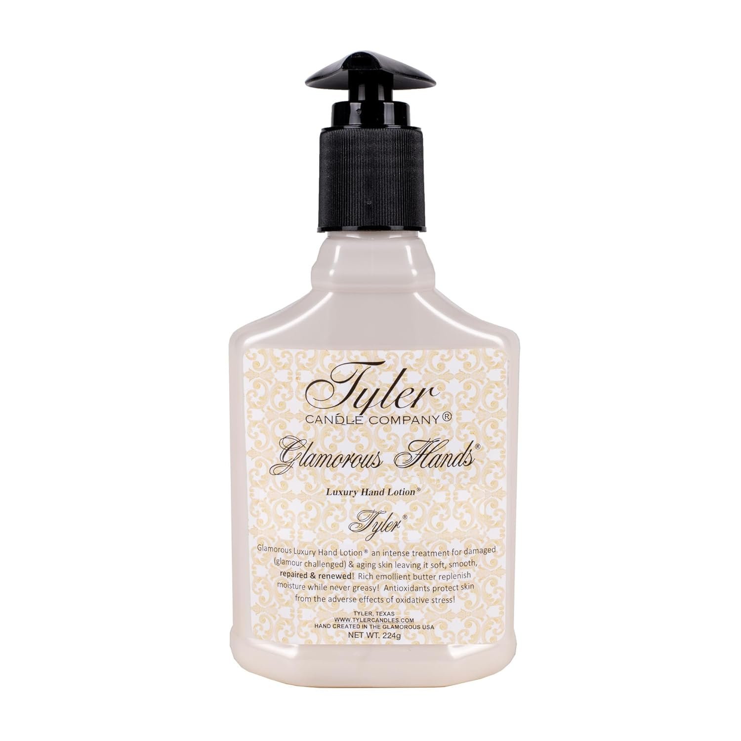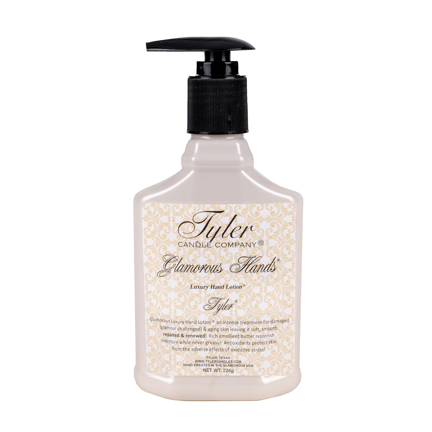 Tyler Candle Glamorous Luxury Hand Lotion 8 Oz. is an intense treatment for damaged and aging skin on the hands. Fruit extracts and acids exfoliate the skin, leaving it soft, smooth, repaired and renewed. Rich emolient butter soothes and replenishes skin’s moisture while never greasy. Antioxidants protect skin from the adverse effects of oxidative stress. Tyler is bursting with the medley of currant & grapefruit. A dash of green undertones adds an opulent twist. The Tyler fragrance is firmly grounded with confidence.