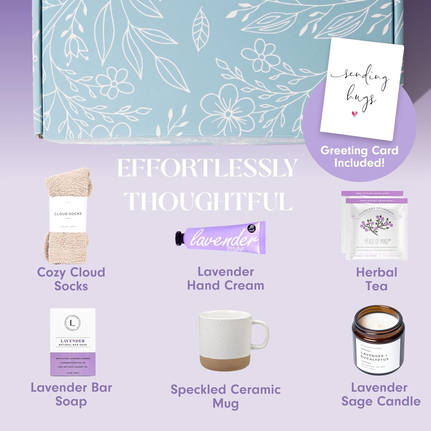 Luxury Lavender Gift Set: Packed with a little something for everyone, this thoughtful relaxation gift includes a lavender soap bar, lavender sage hand cream & lavender sage candle, white cozy socks, relaxing tea +speckled mug & a ‘Sending Hugs’ greeting card