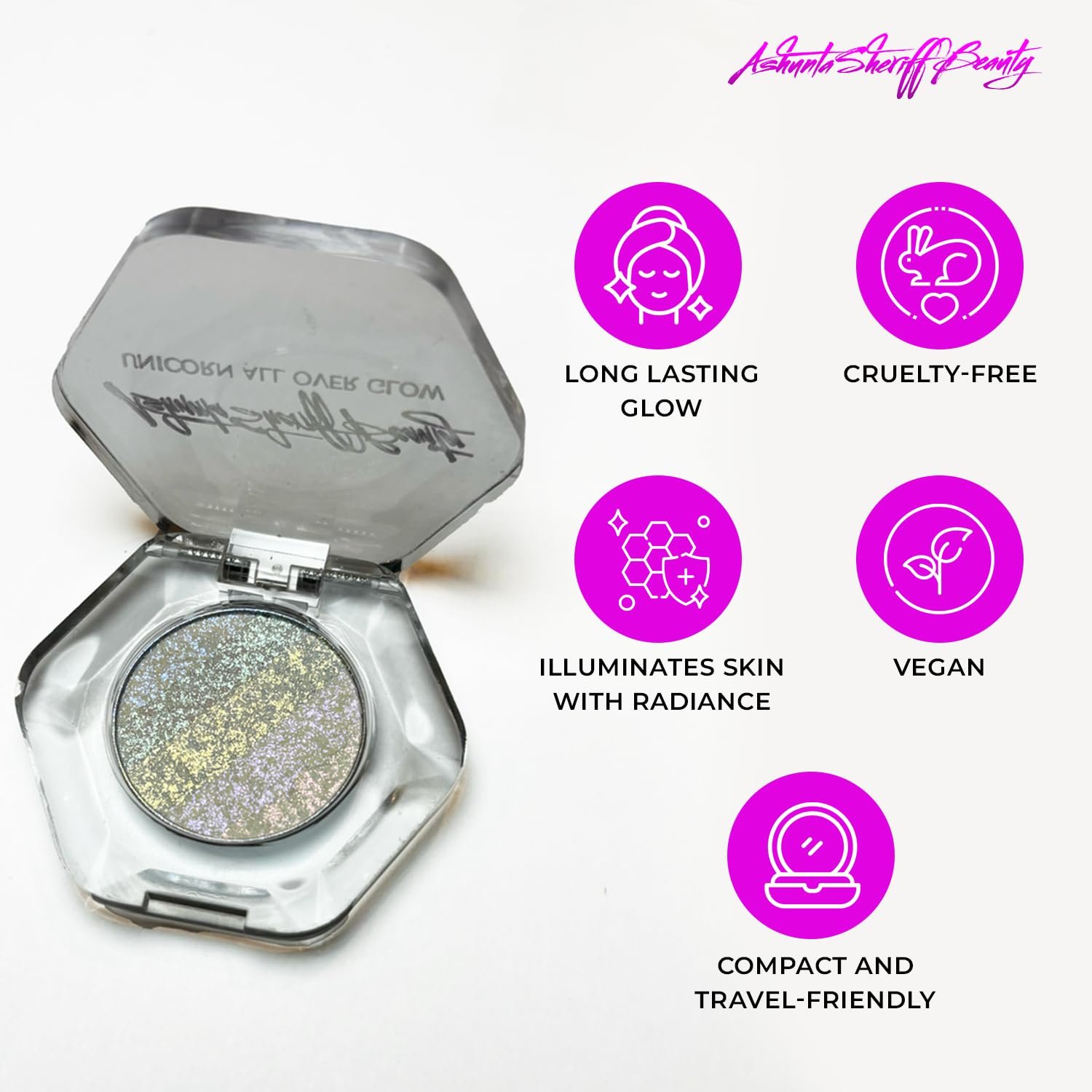 Magical Multi-Chromatic Pigments: Infused with pastel pigments that shift with light, the Unicorn All Over Glow Highlighter delivers an iridescent, radiant finish. Its color-changing effect enhances every angle, creating a mesmerizing, luminous glow.