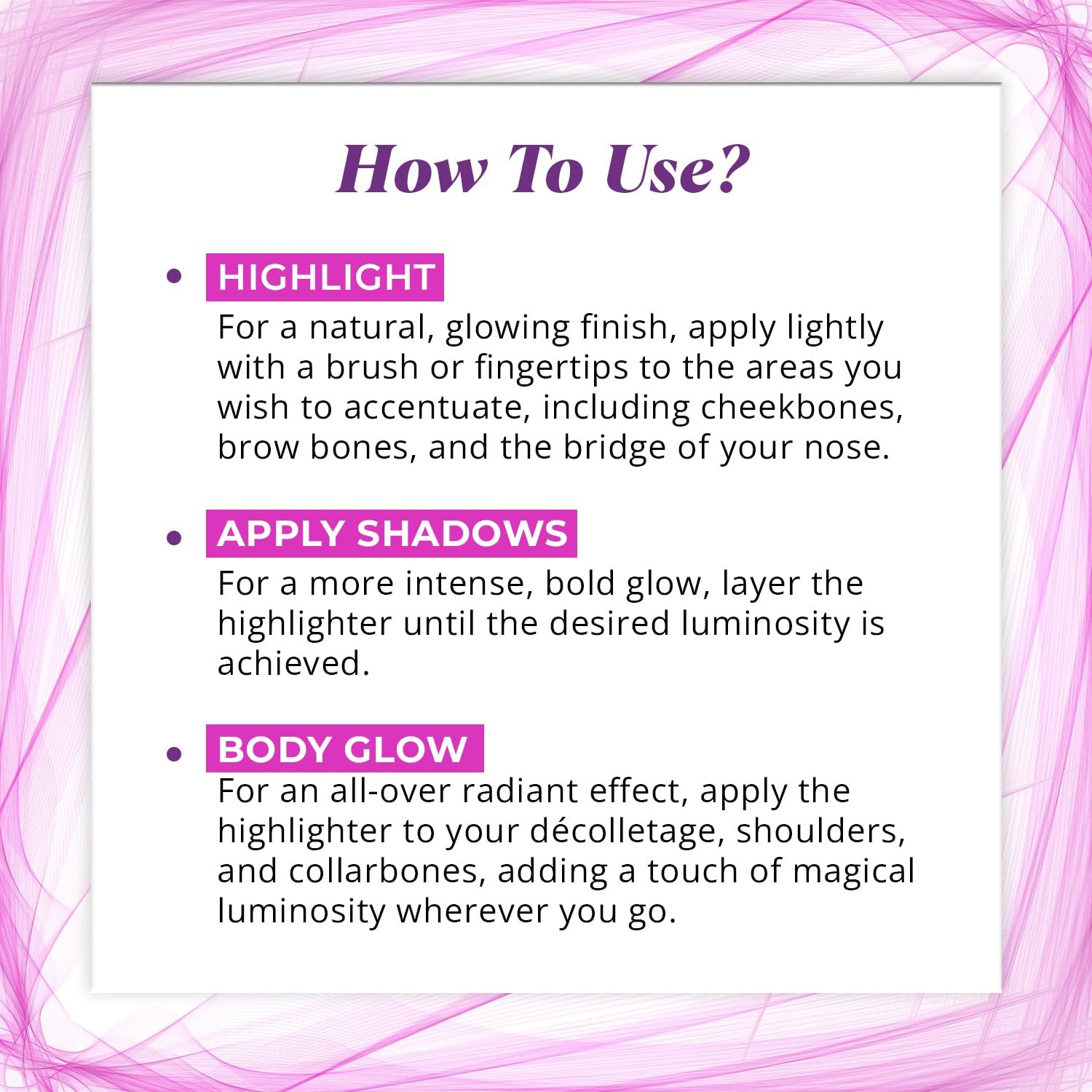Versatile Application: Use this highlighter on your cheekbones, cupid’s bow, brow bone, bridge of your nose, or anywhere you want to add a radiant glow. It can also be used on the décolletage and shoulders for an all-over body glow.