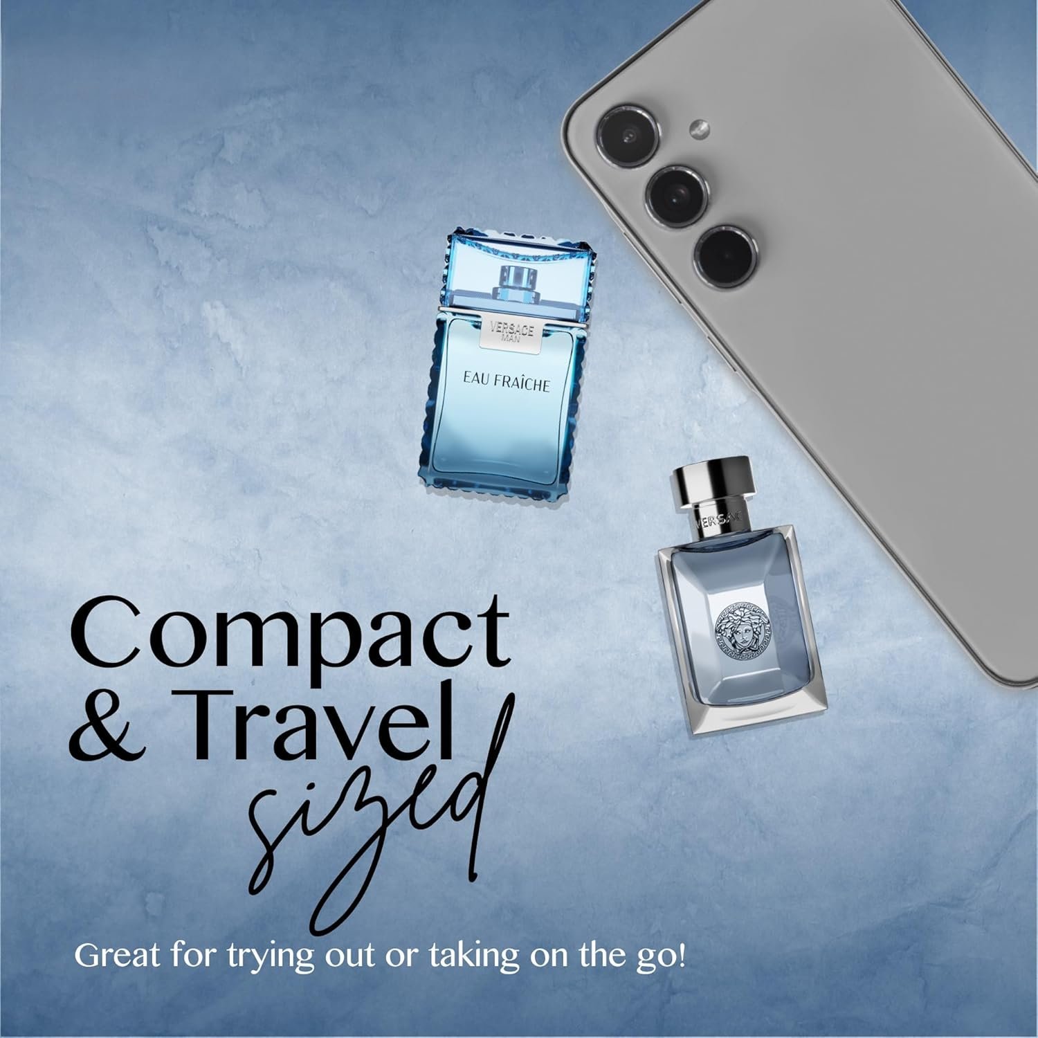 Sophistication. Allure. Versace. Experience the aroma of luxury with this sample set of 4 mens Versace cologne for men mini perfumes. This curated collection of 4 iconic scents is the perfect men’s cologne sample set for trial before purchasing the big bottle or for indulging in a personal treat, belonging to you alone. This Versace men perfume set includes: